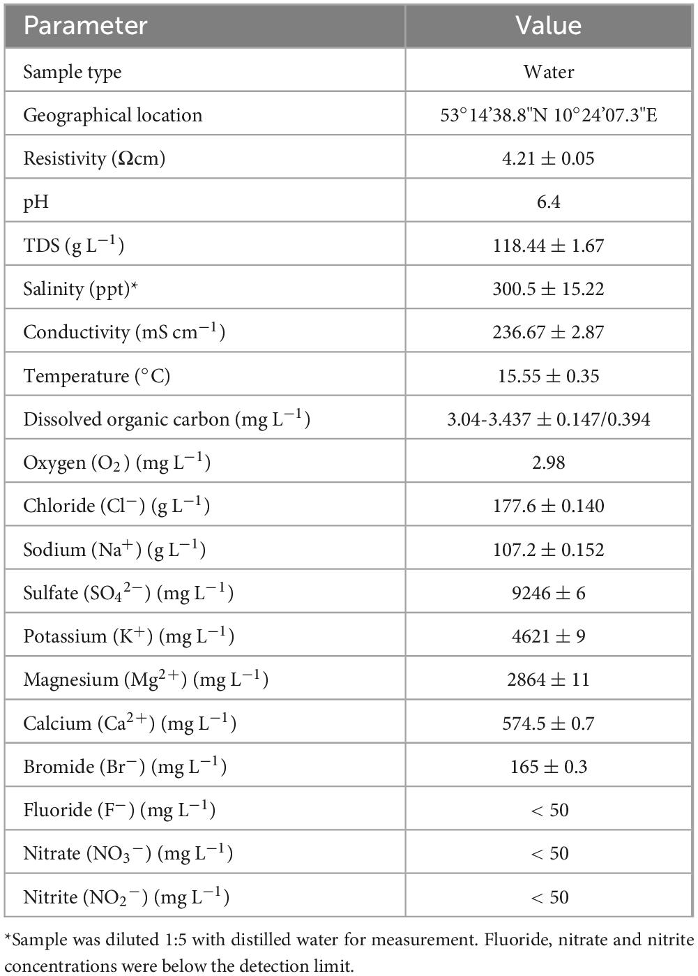 The brine was accessed via a faucet at the Salt Museum, and was pumped from the well at a depth of approx. 40 m with a pipe distance of 100–150 m. In addition to prior analyses of the brine composition by the German Salt Museum (Table 1), we measured hydrochemical parameters including temperature, conductivity, salinity, total dissolved solids (TDS), as well as resistivity directly at the sampling site within three distinct measurements. The pH was measured twice (Metler Toledo, InLab 738-ISM-5 m, Inlab Expert Gp-5 m-ISM) (Table 2). Ca2+, K+, Mg2+, Na+, F–, Cl–, SO42–, Br–, NO3–, NO2– and the dissolved organic carbon (DOC) content were analyzed externally after particle filtration using a polyethersulfone filter with a pore size of 0.45 μm. The sample for major cation analysis (Ca2+, K+, Mg2+, Na+) was additionally acidified (pH 2) with nitric acid (68%), and measured using inductively coupled plasma atomic emission spectrometry, whilst anions (F–, Cl–, SO42–, Br–, NO3–, NO2–) were quantified through ion chromatography. The concentrations were measured in triplicates. The DOC content was determined after high-temperature catalytic oxidation and non-dispersive infrared detection and was measured in duplicates (Lehmann et al., 2021).