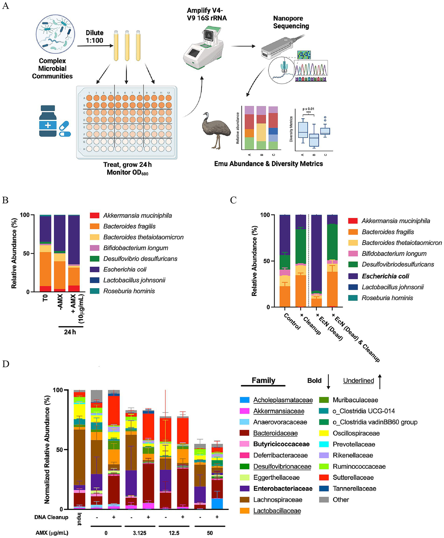 Establishment of pipeline in synthetic consortia community and murine cecal communities. (A) Experimental design for culturing various community inputs to obtain sequencing data. Figure was created using Biorender. (B) Average relative abundances of species comprising a synthetic community treated with or without amoxicillin over 24 h. Data are represented as average relative abundance for n = 3–5 replicates. (C) Average relative abundance of species of the synthetic community spiked with E. coli killed from 100 μg/mL AMX and treated with DNA Cleanup step. Data are represented as average relative abundance ± STD for n = 4. (D) Average normalized relative abundances of families within cecal communities treated with or without amoxicillin and/or the DNA cleanup step for 24 h. Families in bold represent families that are reduced in response to the cleanup step, while families underlined increase in response to the cleanup step. Data are represented as average relative abundance normalized against the highest OD600 ± STD for n = 6.
