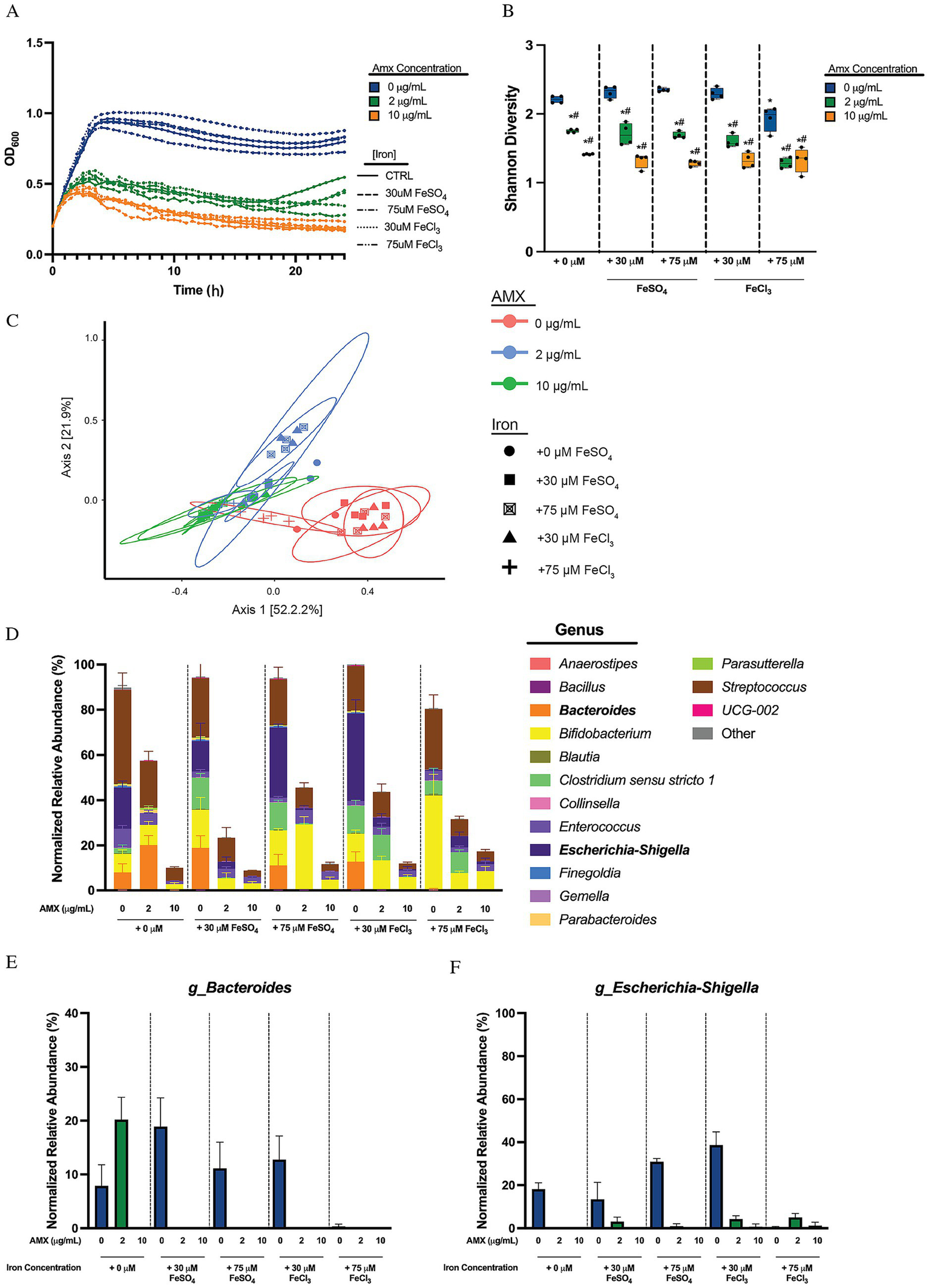 Free ferric and ferrous iron minimally impacts human microbial sample community makeup. (A) Optical density at 600 nm of microbial human stool sample cultures measured every 30 min over 24 h. Data are represented as means of OD600 of n = 6. (B) Alpha diversity of sample cultures as measured by Shannon diversity index. Black lines indicate the mean, with whiskers identifying minimum and maximums of the data for n = 4 (*p < 0.05, compared to 0 μg/mL AMX in + 0 μM free iron concentration; #p < 0.05, compared to 0 μg/mL AMX in same free iron conditions). (C) PCoA of beta diversity of samples via Bray–Curtis Dissimilarity. (D) Average normalized relative abundances of genera. Top 15 genera are shown, with all other genera collapsed to “Other.” Genera in bold showed reduction to abundances in response to amoxicillin when given free iron. Data are represented as average relative abundance normalized against highest OD600 of experiment ± STD for n = 4. (E) Average normalized relative abundance of Bacteroides genus extrapolated from (D). Data are represented as average relative abundance normalized against highest OD600 of experiment ± STD for n = 4. (F) Average normalized relative abundance of Escherichia-Shigella genus extrapolated from (D). Data are represented as average relative abundance normalized against highest OD600 of experiment ± STD for n = 4.