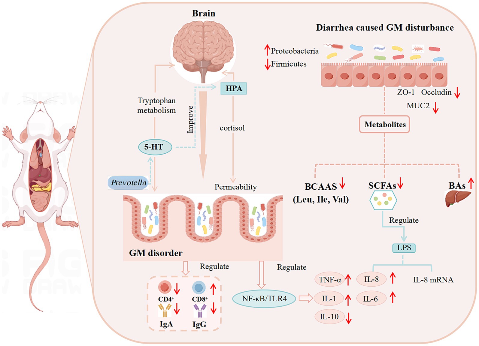In summary, the occurrence of diarrhea can alter the composition of the gut microbiota and the levels of its metabolites, regulate immune function, affect the gut-brain axis, and impair intestinal barrier integrity. The potential mechanisms mediating these effects are illustrated in Figure 1.
