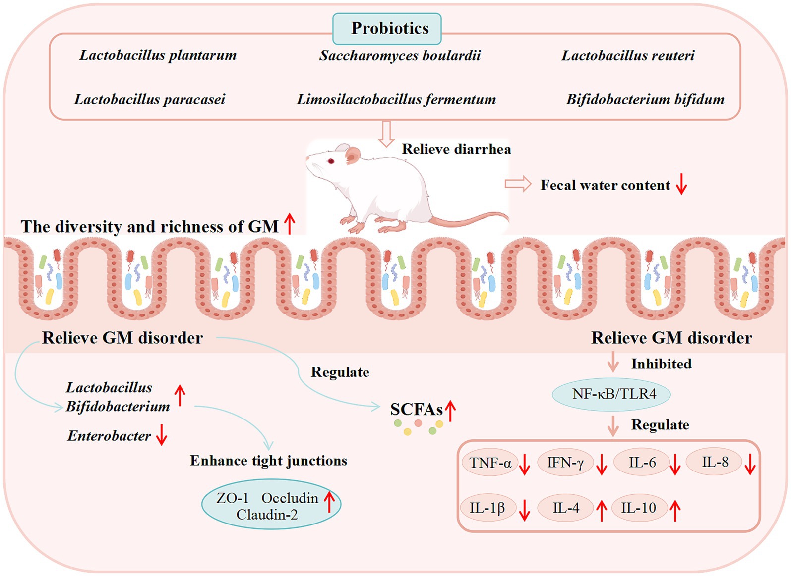 ETEC is a major pathogen of animal diarrhea (Xu C. et al., 2023; Xu Y. et al., 2023; Xu H. et al., 2023), which disrupts the intestinal epithelial barrier through adhesins and enterotoxins (Zhu et al., 2018). It has been found that Lactobacillus plantarum ZLP001 has antimicrobial activity, which prevents ETEC growth by producing certain antimicrobial substances and generating a relatively acidic environment (Wang et al., 2018b). Treatment with L. plantarum ZLP001 alleviated ETEC-induced intestinal damage by preserving the expression of TJ proteins (claudin-1, occludin, ZO-1), downregulating pro-inflammatory cytokines (IL-6, IL-8, TNF-α), and strengthening the intestinal barrier via enhancing epithelial defense and modulating the GM (Wang et al., 2018a). AAD triggered by GM dysbiosis post-antibiotic therapy, poses serious threat to human and animal health. However, Lactobacillus plantarum H-6 was found to modulate the colonic microbial composition in mice by increasing the abundance of Lactobacillus and Akkermansia, decreasing that of Bacteroides, downregulating the expression of pro-inflammatory factors (e.g., IL-1β, IL-6), and elevating the levels of L-tryptophan and LysoPC. These changes improve serum metabolism, thereby alleviating AAD (Yan et al., 2023). In addition, Akkermansia muciniphila was able to reduce the relative abundance of Citrobacter at the genus level, inhibit intestinal inflammation by up-regulating the expression of G protein-Coupled Receptor 109A (GPR109A) and Solute Carrier family 5 member 8 (SLC5A8) and down-regulating the expression of TNF-α, IFN-γ, IL-1β, and IL-6, and at the same time improve the down-regulation of ZO-1, Occludin, Claudin-4 (CLDN4), and Muc2 in AAD model mice, restore the intestinal barrier function and optimize intestinal health to prevent AAD (S. Liu et al., 2024). Saccharomyces boulardii can upregulate Serotonin Transporter (SERT) through activation of epidermal growth factor receptor and modulate GM to inhibit gut motility to alleviate IBS-D symptoms (Gu et al., 2022). The efficacy of other probiotics in modulating the GM for diarrhea treatment is summarized in Table 2, while the potential mechanisms underlying probiotic-mediated diarrhea management are illustrated in Figure 2.