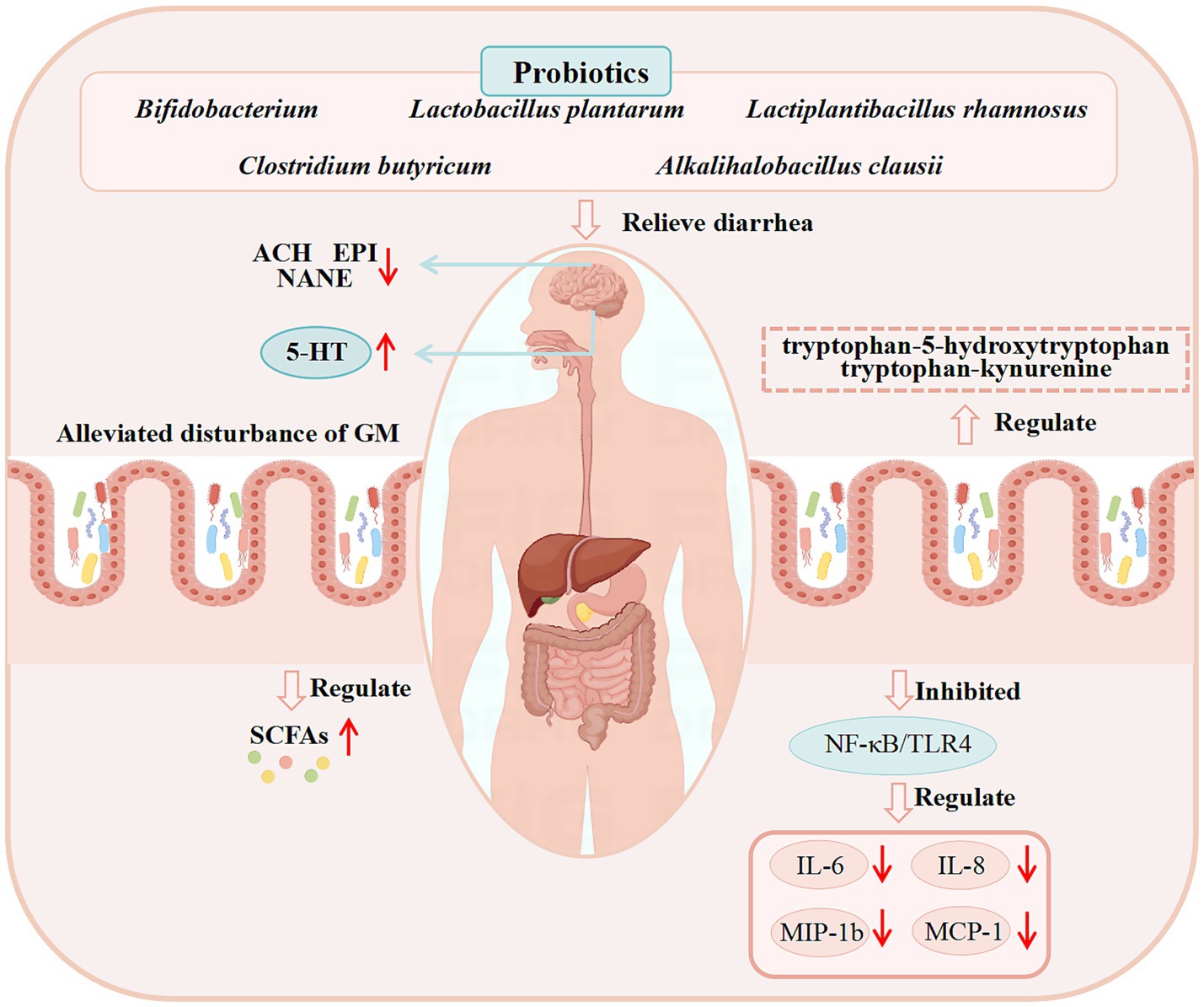 Clinical studies have extensively documented the efficacy of probiotics in managing diarrhea. Bifidobacterium bifidum G9-1 was reported to reduce serum pro-inflammatory cytokine (Monocyte Chemoattractant Protein-1, IL-8 and Macrophage Inflammatory Protein-1β) levels and increase the abundance of Bifidobacterium, alleviating diarrhea in IBS-D patients (Tomita et al., 2023). Similarly, longum ES1 significantly lowered serum IL-6 and TNF-α levels in IBS-D patients compared to baseline (Caviglia et al., 2020). Clostridium butyricum ameliorated diarrhea in IBS-D patients by decreasing stool frequency and modulating GM composition (Sun et al., 2018). Lactobacillus plantarum LRCC5310 improved diarrhea and Vesikari scores in rotavirus-infected children while suppressing viral proliferation (Shin et al., 2020). Alkalihalobacillus clausii 088AE exerts a therapeutic effect on diarrhea in children, adolescents, and adults. Specifically, in the treatment of AAD, it has been demonstrated to be safe and effective in reducing diarrhea episodes and alleviating associated severe symptoms, such as abdominal discomfort, pain, bloating, and flatulence (Maity and Gupta, 2021). However, supplementation with Bifidobacterium breve BB05 can partially restore the disrupted GM at both the phylum and genus levels, notably by elevating the abundances of Bifidobacterium and Roseburia. In the probiotic-supplemented group, fecal 5-HT concentration was increased, whereas levels of acetylcholine, epinephrine, and norepinephrine were reduced—suggesting that Bifidobacterium breve BB05 may alleviate anxiety and diarrhea by BGMA (Wang Y. et al., 2024).
