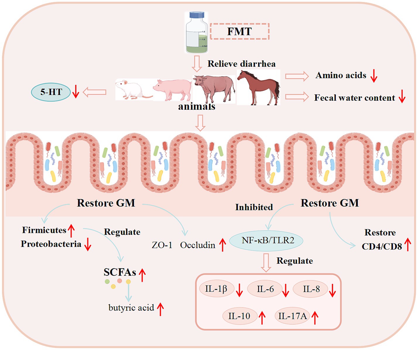 Diarrhea in animals, triggered by multiple etiologies, is highly prevalent and remains a major challenge afflicting the animal husbandry industry. To address this issue, FMT-an emerging therapeutic technology-has been increasingly applied to the treatment of animal diarrhea in recent years.
