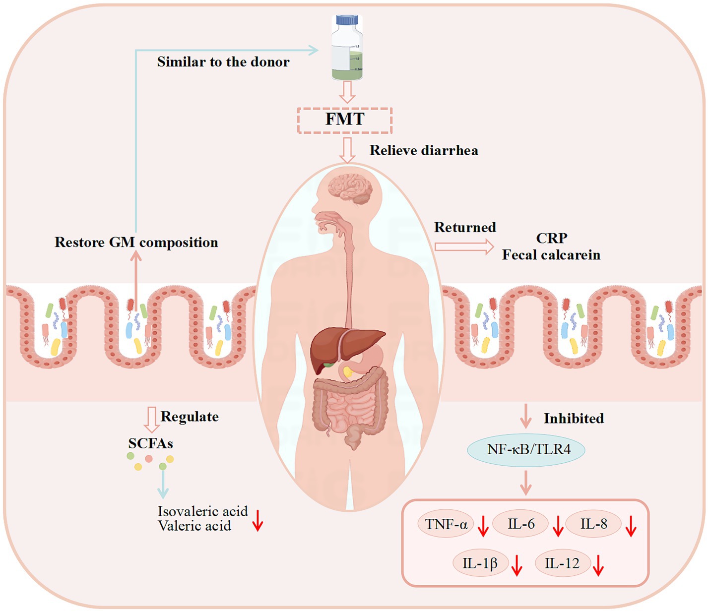 FMT has emerged as a novel clinical strategy for treating diarrhea. As an intestinal microecological therapy with proven efficacy, FMT entails the transfer of GM from healthy donors to patients with diarrhea, which modulates GM composition, restores the intestinal mucosal immune barrier, and thereby exerts therapeutic effects.