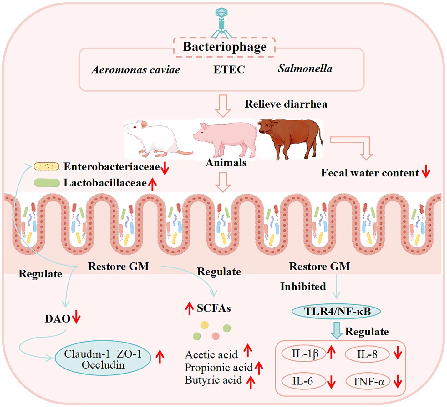 Diarrhea is now a significant public health concern. Consequently, bacteriophage therapy has emerged as a promising therapeutic strategy. Phages modulate the composition and abundance of the GM, which in turn alters the expression of intestinal proteins and inflammatory factors, ultimately alleviating various forms of diarrhea.