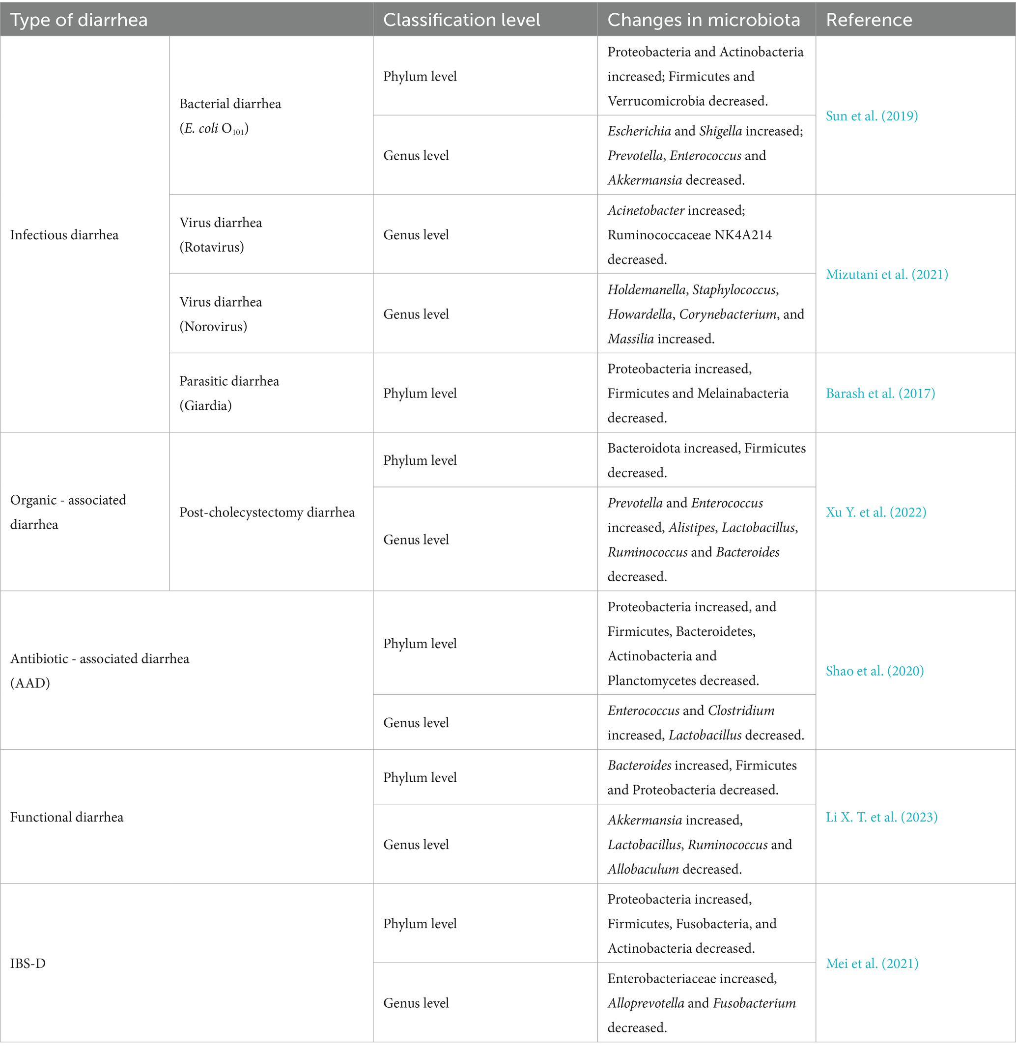 Furthermore, it has been observed that other types of diarrhea are also closely associated with alterations in the GM (Table 1). Thus, it is evident that dysbiosis of the GM exists across various forms of diarrhea.