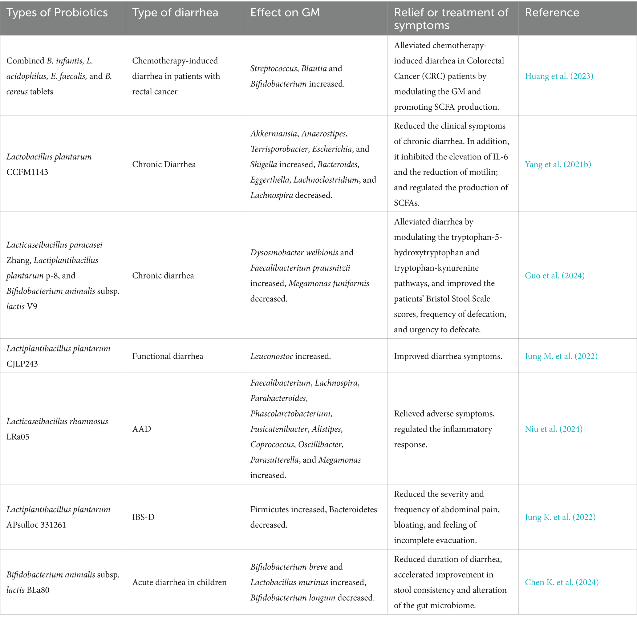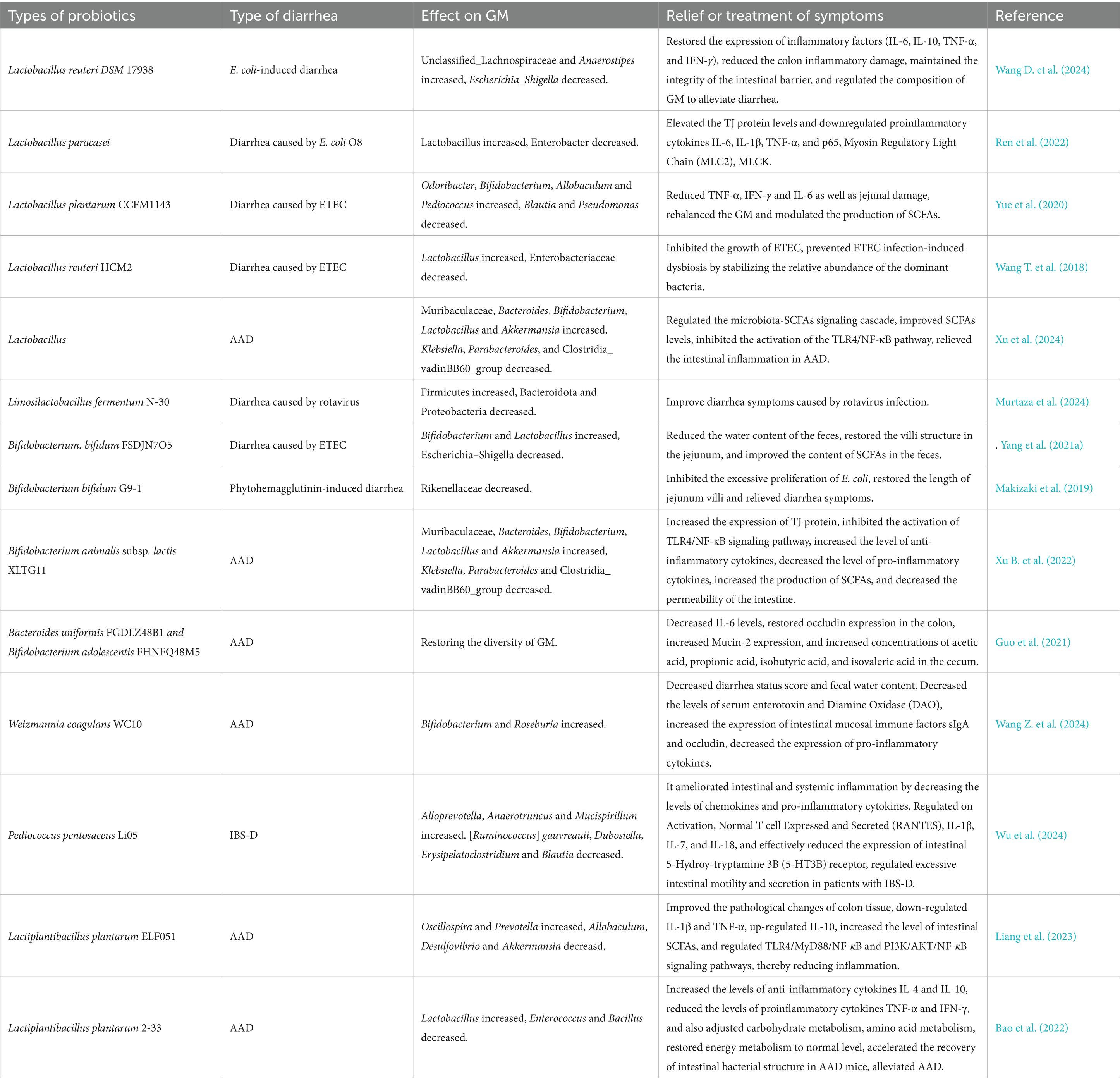 Probiotics are defined as beneficial, viable microorganisms, and a growing body of evidence has shown that numerous probiotic strains alleviate diarrhea by modulating the GM (Wieërs et al., 2019), regulation of inflammatory factor production (Wang F. et al., 2023), and enhancement of the intestinal mucosal barrier function (Camilleri, 2021; Su et al., 2022).