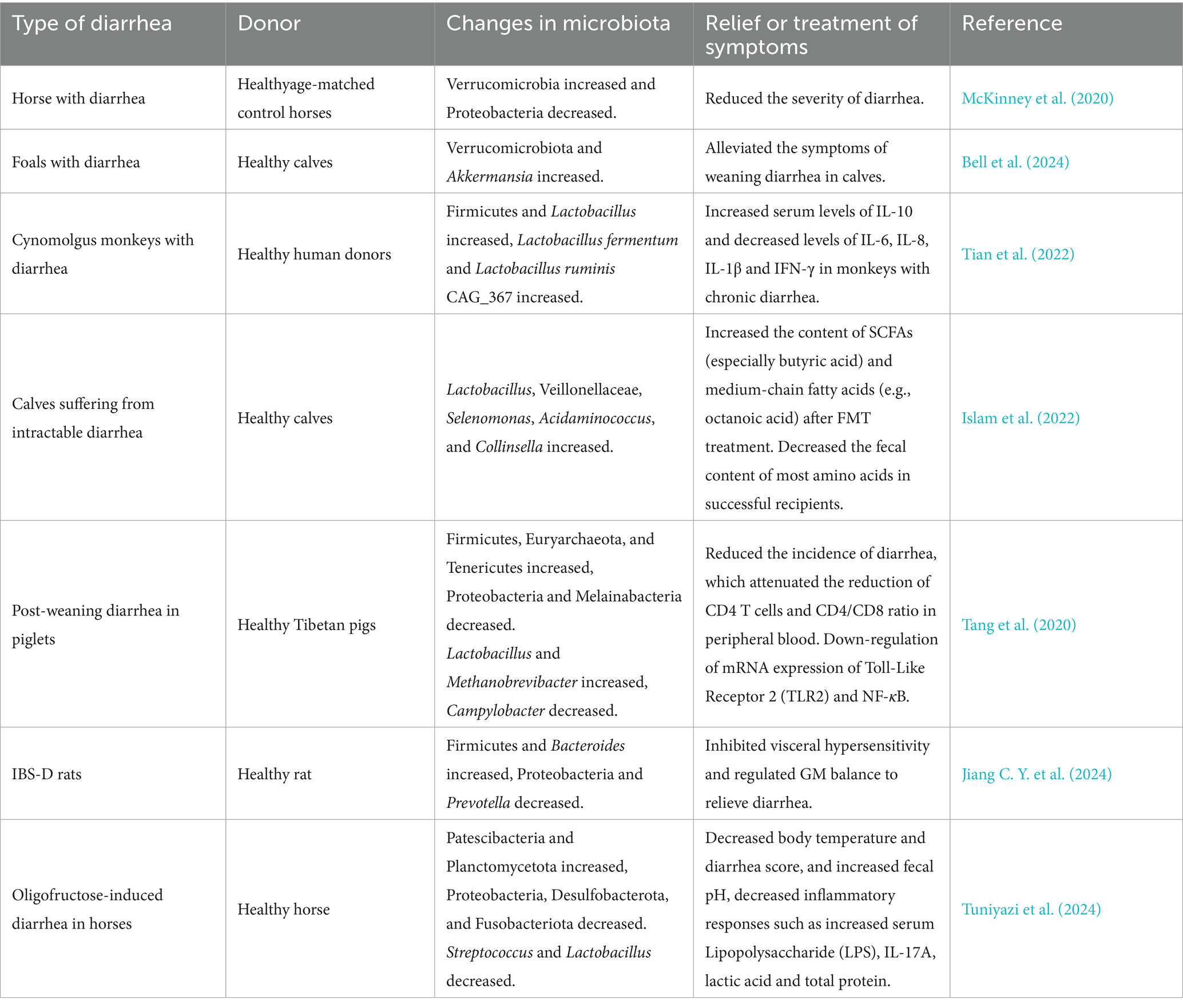 The therapeutic efficacy of FMT in diarrhea alleviation is closely linked to the modulation of GM composition. On one hand, FMT reintroduces a healthy microbial community that competes for ecological niches in the gastrointestinal tract, thereby suppressing pathogen colonization-this process further facilitates the restoration of immune function and mitigates host tissue damage. On the other hand, FMT aids in replenishing essential metabolites for host metabolism, such as SCFAs, antimicrobial peptides, bacteriocins, and BAs (Ademe, 2020). IBS-D is a common gastrointestinal disorder and is characterized by altered GM, especially involving Firmicutes and Bacteroidetes (Mei et al., 2021; Zhen et al., 2021). However, FMT can reduce intestinal permeability and alleviate the diarrheal effects of IBS-D by modulating GM disorders and affecting GM-produced metabolites such as increasing the production of SCFAs (Lin et al., 2021; Singh et al., 2022; Song et al., 2023). Clostridium difficile infection (CDI) is considered a common cause of AAD (Bosnjak et al., 2023; Tubau-Juni et al., 2023). One study demonstrated that FMT administration to children with recurrent CDI enhanced GM diversity while driving shifts in GM composition and function toward those of the donor (Fareed et al., 2018). During the weaning transition, piglets are prone to diarrhea, which is related to the damaged state of the microbiome and immature immune system (Han et al., 2024). In diarrheal piglets infected with E. coli K88, the application of FMT increased the number of beneficial bacteria in the gut and reduced the number of harmful bacteria, and further research found that FMT triggered intestinal mucosal autophagy and reduced the damage of E. coli K88 to the intestinal barrier (Cheng et al., 2018).