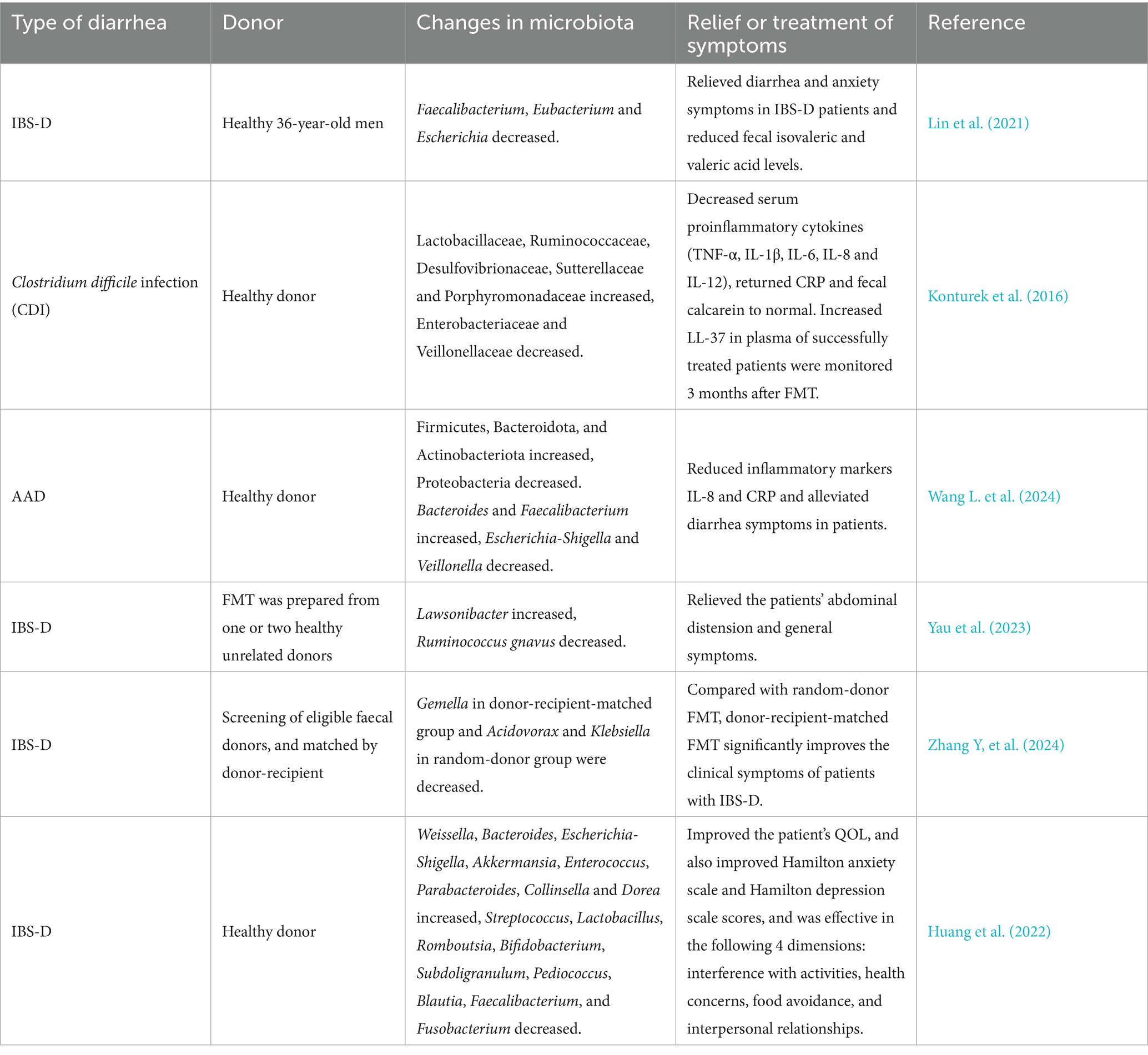 CDI is the main cause of nosocomial infectious diarrhea and a high proportion of clinical cure rates have been achieved by restoring the GM with FMT in CDI therapy (Chen and Chiu, 2022; Roshan et al., 2020). Shao et al. found a significant increase in a diversity of GM in CDI patients after FMT, with GM composition more similar to that of healthy donors, increased the abundances of families Ruminococcaceae, Prevotellaceae, Coriobacteriaceae, Porphyromonadaceae, Bacteroidaceae, Bifidobacteriaceae, and Eubacteriaceae, and reduced the abundance of Enterobacteriaceae, Veillonellaceae, Enterococcaceae, and Peptostreptococcaceae (Wei et al., 2022). Clinically, FMT alleviates IBS-D symptoms and improves patients’ quality of life by restoring a balanced GM (Fu and Huang, 2022). Studies have shown that GM and SCFAs in patients with IBS-D differ from those of donors at baseline, such as decreased levels of Actinobacteria and Bifidobacterium and increased levels of Bacteroidetes and Proteobacteria, however these differences gradually return to normal after 3 weeks after FMT, while patients also have improved symptoms and quality of life of IBS-D during the same period (Mazzawi et al., 2019). However, some studies have also shown conflicting results. For example, studies in the treatment of IBS-D have shown that both FMT and placebo recipients showing improvements in irritable bowel syndrome-Severity Scoring System (IBS-SSS) and irritable bowel syndrome-Quality of Life (IBS-QOL) scores and reporting improvements in fecal morphology, however, no differences were found between the two groups (Aroniadis et al., 2019). Therefore, more research is needed to determine the efficacy of FMT for IBS-D.
