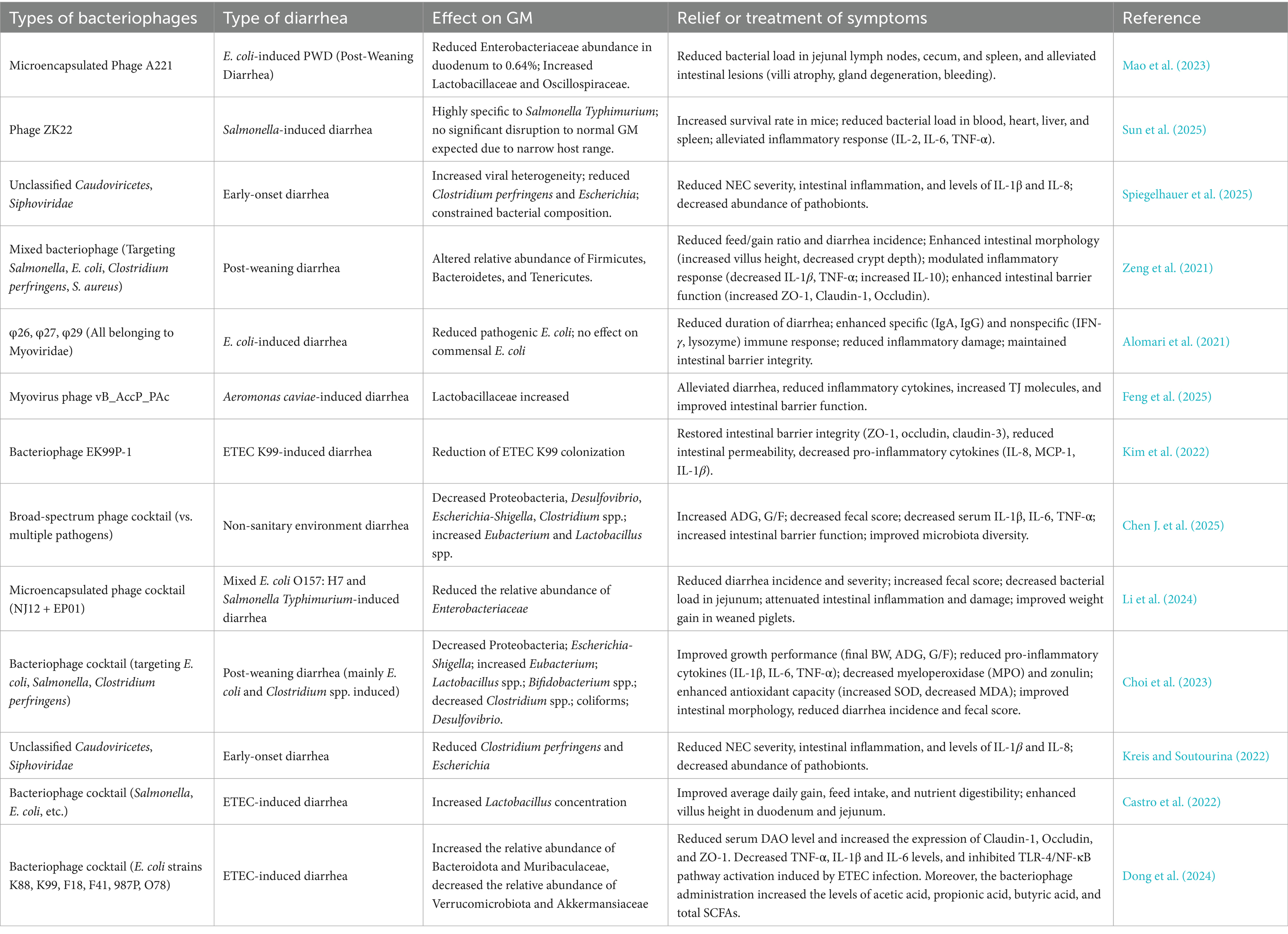Multiple in vitro studies have demonstrated the effectiveness of phage therapy for treating diarrheal pathogens. Research has shown that a phage cocktail targeting E. coli, such as a combination of six bacteriophages, can reduce bacterial load by 3 log CFU/mL in vitro and effectively inhibit biofilm formation (Youssef et al., 2025). In addition, a 2023 study utilized a resource library termed the gut phage isolate collection (GPIC)—composed of bacteriophages isolated from healthy human guts—to demonstrate that a bacteriophage cocktail targeting Bacteroides fragilis significantly reduced the abundance of the target bacteria in in vitro fecal cultures, highlighting the potential of bacteriophages in modulating the GM (Shen et al., 2023). In animal model studies, phage therapy has also shown promising effects. Research has shown that the microencapsulated bacteriophage A221 is as effective as the antibiotic florfenicol in treating piglet diarrhea models (Youssef et al., 2025). In addition, phage cocktail therapy targeting Klebsiella pneumoniae associated with inflammatory bowel disease can alleviate intestinal inflammation and tissue damage in mouse models (Fuerte-Stone and Mimee, 2022). These studies indicate that bacteriophages can not only effectively reduce the load of pathogenic bacteria, but also alleviate the inflammatory response and tissue damage caused by it.