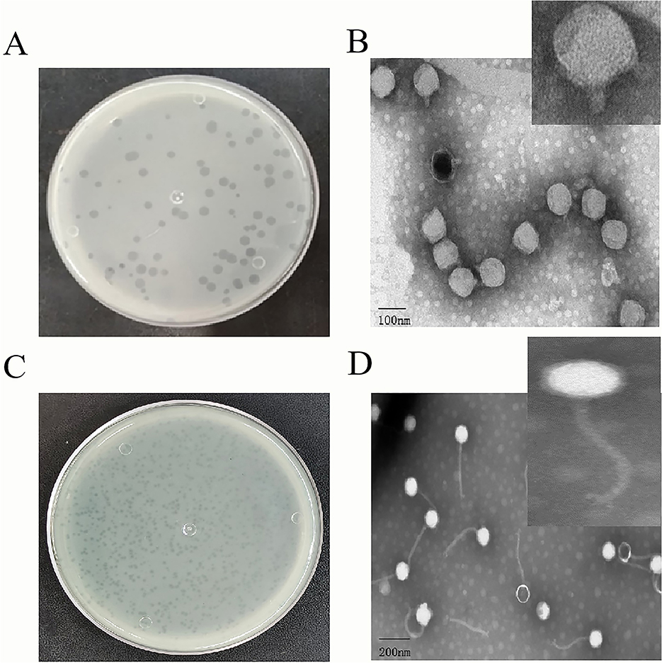 Figure 1. Morphological characteristics of Pseudomonas syringae pv. syringae phages PSV6 and PSV3. (A) Phage plaque morphology of PSV6 on an LB double-layer agar plate. (B) Transmission electron microscopy (TEM) image of PSV6. (C) Phage plaque morphology of PSV3 on an LB double-layer agar plate; (D) TEM image of PSV3.