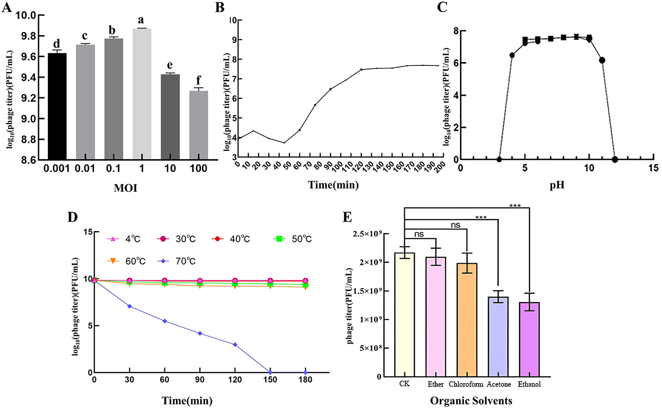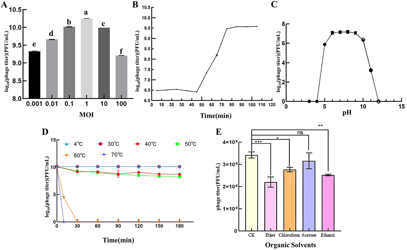 Figure 2. Biological features of the PSV6. (A) Titers at different multiplicities of infection. One-way ANOVA was performed, and different letters above the error bars indicate significant differences. (B) One-step growth curve. (C) pH stability. (D) Temperature stability. (E) Effect of organic solvents on phage survival. Values are means from three independent experiment. Error bars represent standard deviation. One-way analysis of variance (ANOVA) was used to assess statistical significance, ns: no significant difference, *P < 0.05, **P < 0.01, ***P < 0.001. Each assay was performed in triplicate. Values represent averages, and error bars represent standard deviation.