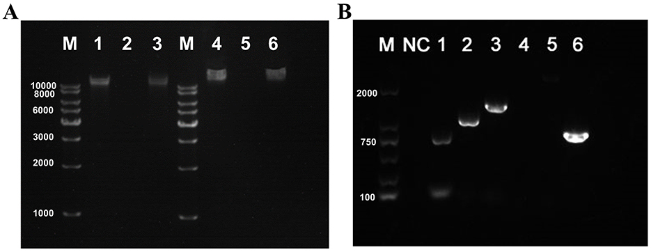 Figure 4. Verification of nucleic acid types and genomic morphology of PSV6 and PSV3. (A) Genome digestion patterns of phage PSV6 and PSV3. M: 1 Kb DNA Marker; 1: Untreated PSV6 genome; 2: PSV6 genome digested with DNase I; 3: PSV6 genome digested with RNase A; 4: Untreated PSV3 genome; 5: PSV3 genome digested with DNase I; 6: PSV3 genome digested with RNase A. (B) Validation of genomic DNA morphology for phages PSV6 and PSV3. M: 2000 bp DNA Marker; NC: Negative control (ddH2O replacing PSV6 template DNA); 1–3: Three different reverse primers for PSV6; 4–5: Two different reverse primers for PSV3; Lane 6: Positive control for PSV3 (forward primer pair).