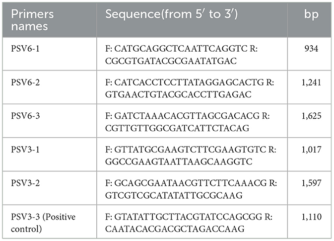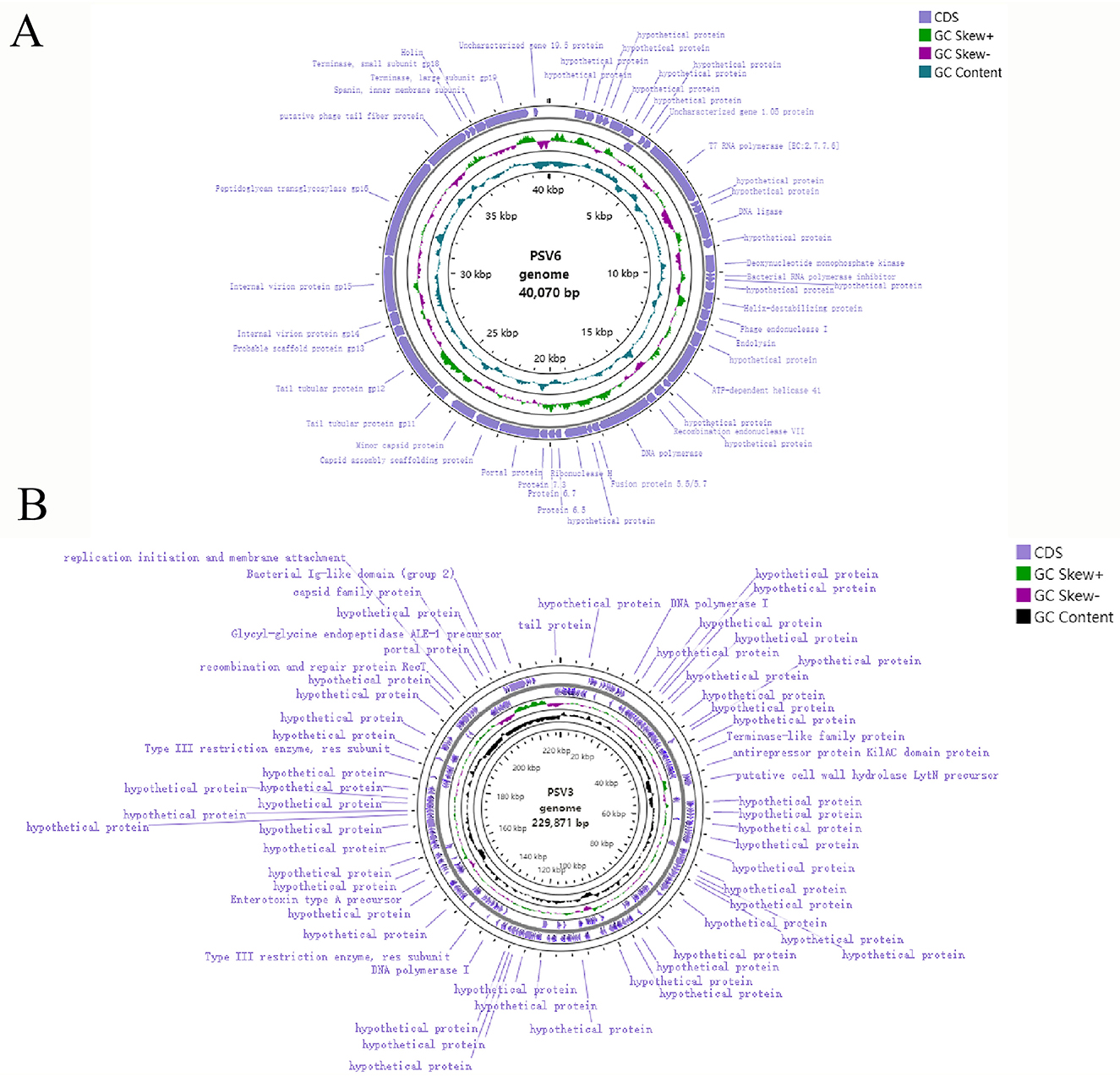 Phage genomic DNA was extracted using an OMEGA-Viral DNA kit 50 (Guangzhou Feiyang Biological Engineering Co., Ltd, China) following the manufacturer's instructions. The extracted phage genomes were treated with DNase I and RNase A to determine the type of nucleic acid present. To verify whether the genomes of PSV6 and PSV3 are circular or linear, three pairs of reverse primers for PSV6 and two pairs of reverse primers for PSV3 were designed, along with one pair of forward primers as a positive control. The sequences of primers are listed in Table 1. PCR amplification was performed using the phage DNA as the template. The presence of bands indicated circular DNA, whereas their absence suggested linear DNA.