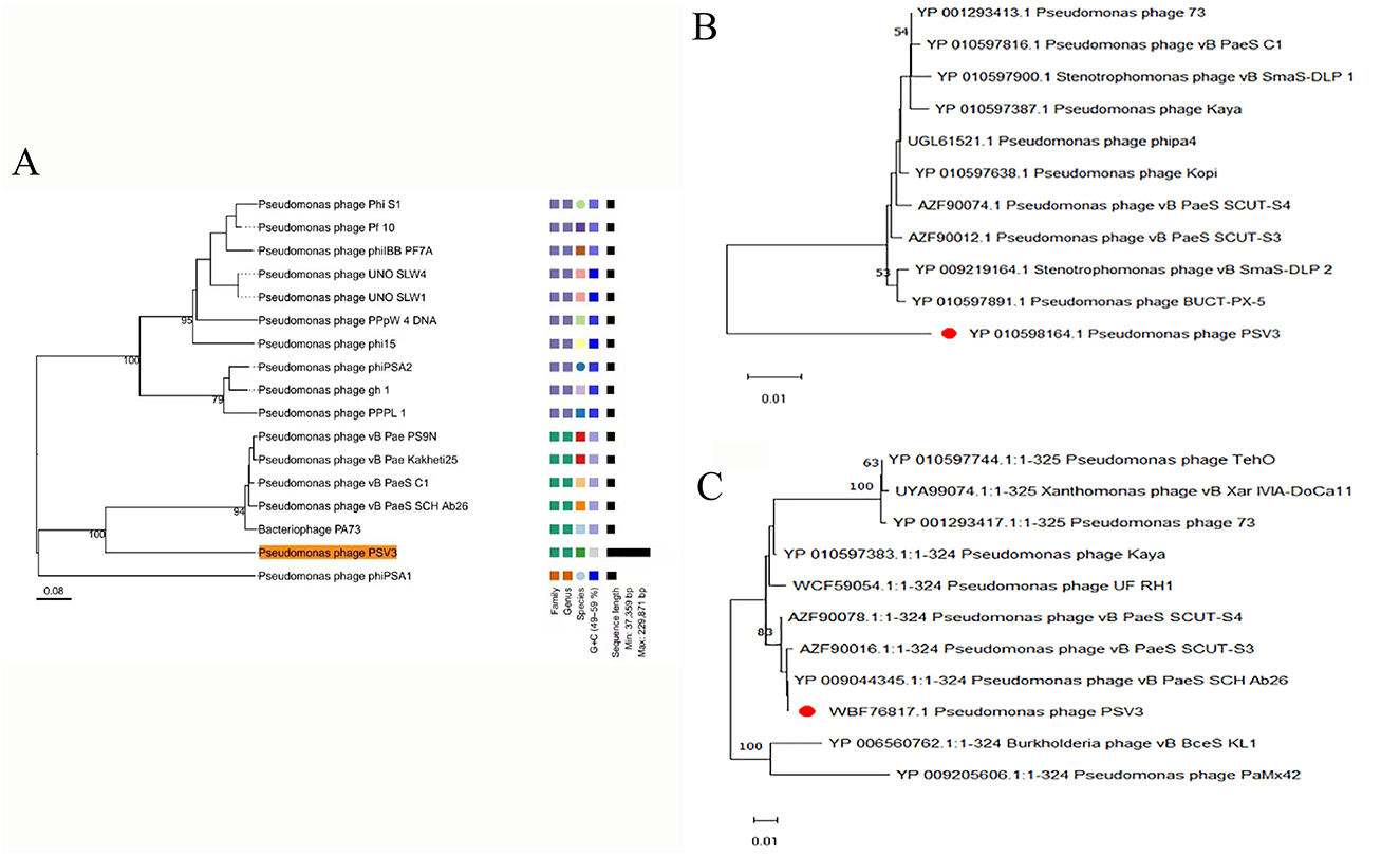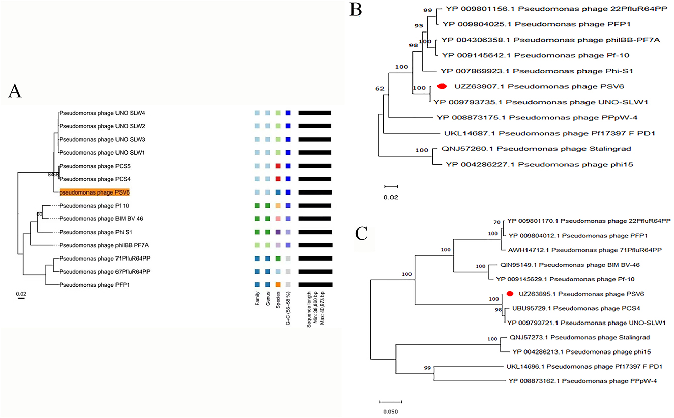 Figure 6. Phylogenetic trees of PSV6 using (A) whole-genome sequences (the right side of the figure indicates the classification levels: family, genus, species, and GC content similarity); (B) terminase large subunits, and (C) major capsid protein, with the neighbor-joining method.