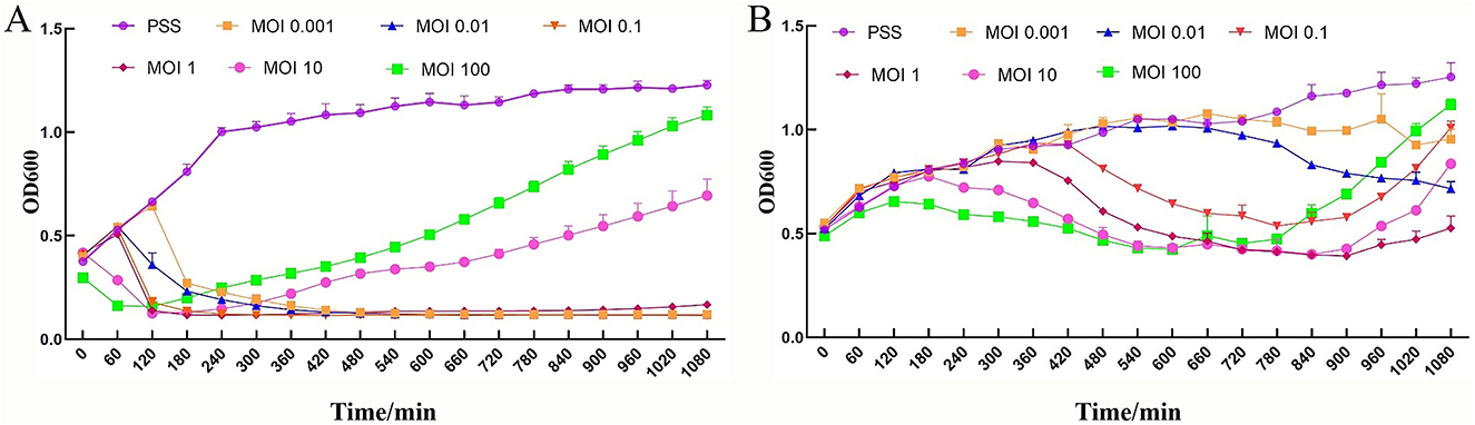 To assess the effects of PSV6 and PSV3 on Pss and generate lysis curve experiments, a 1–2% inoculum of Pss was cultured in 50 mL LB liquid medium at 30 °C with shaking at 180 rpm/min until it reached the logarithmic growth phase. PSV6 and PSV3 phages were then added to the culture at MOIs of 0.001, 0.01, 0.1, 1, 10, and 100, and incubation continued under the same conditions. A total of 200 μL of culture was sampled hourly, and the OD600 was measured using a microplate reader. The control group included a host bacterial suspension without phages or a phage suspension without host bacteria. Three replicates were performed for each group, and the experiment was repeated three times.