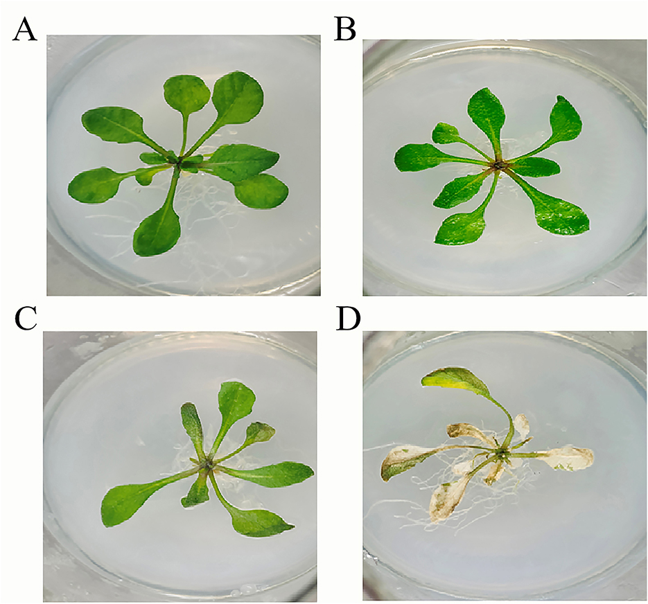 Arabidopsis seeds were purchased from Yunnan Chi'en Technology Co., Ltd. The seeds were surface-sterilized by soaking in 10% NaClO for 5 min, followed by 3–5 washes with sterile water, immersion in 75% ethanol for 1 min, and five washes with sterile water. Sterilized seeds were sown on Murashige and Skoog (MS) solid medium plates, with 30–40 seeds per plate. The plates were maintained at 4° C for 3–5 d to induce seed vernalization. They were then transferred to a plant growth chamber at 25° C under a 16-h/8-h light/dark cycle for 1 week. Finally, the seedlings were transferred into 350 mL culture bottles containing MS medium and grown in a sterile culture room for 3 weeks.