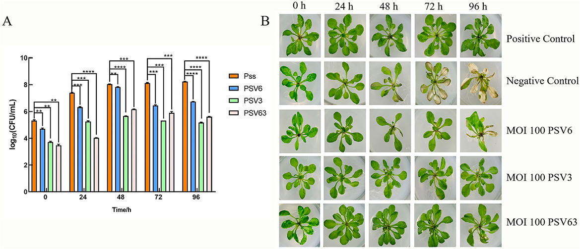 Figure 10. Control effect of phage treatment on Pseudomonas syringae pv. syringae (Pss) at an MOI 100 for 15 min. (A) Different phage treatments inhibit Pss at different times: Pss (orange), PSV6 (blue), PSV3 (green), and PSV6 and PSV3 co-treatment (pink). Values are means from three independent experiment. One-way analysis of variance (ANOVA) was used to assess statistical significance, ns: no significant difference, *P < 0.05, **P < 0.01, ***P < 0.001, ****P < 0.0001. (B) Bacteriophage control effect on Pss. The positive control was treated with 10 mmol/L MgCl2 buffer, and the negative control was treated with exponential phase Pss.