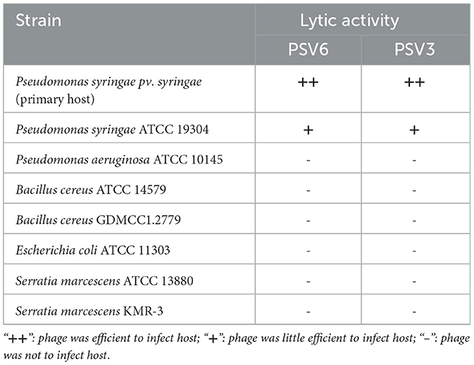 The host range of the Pss phages PSV6 and PSV3 was assessed using the spot assay method. Bacterial strains included P. syringae ATCC 19304, P. aeruginosa ATCC 10145, Bacillus cereus ATCC 14579 and GDMCC 1.3589, Serratia marcescens ATCC 13880, and Escherichia coli ATCC 11303, which were standard strains purchased from the Strain Preservation Center. Additionally, Serratia marcescens KMR-3 was an isolated strain. For each assay, 200 μL of bacterial cells were mixed with 4.5 mL of a semi-solid medium and transferred onto the surface of a double-layer agar plate. A total of 10 μL of the phage suspension (109 PFU/mL) was spotted onto the double-layer agar surface of different bacterial lawns. The plates were incubated at 28° C overnight, and plaque formation within the spotted areas was observed. The experiment was repeated three times.