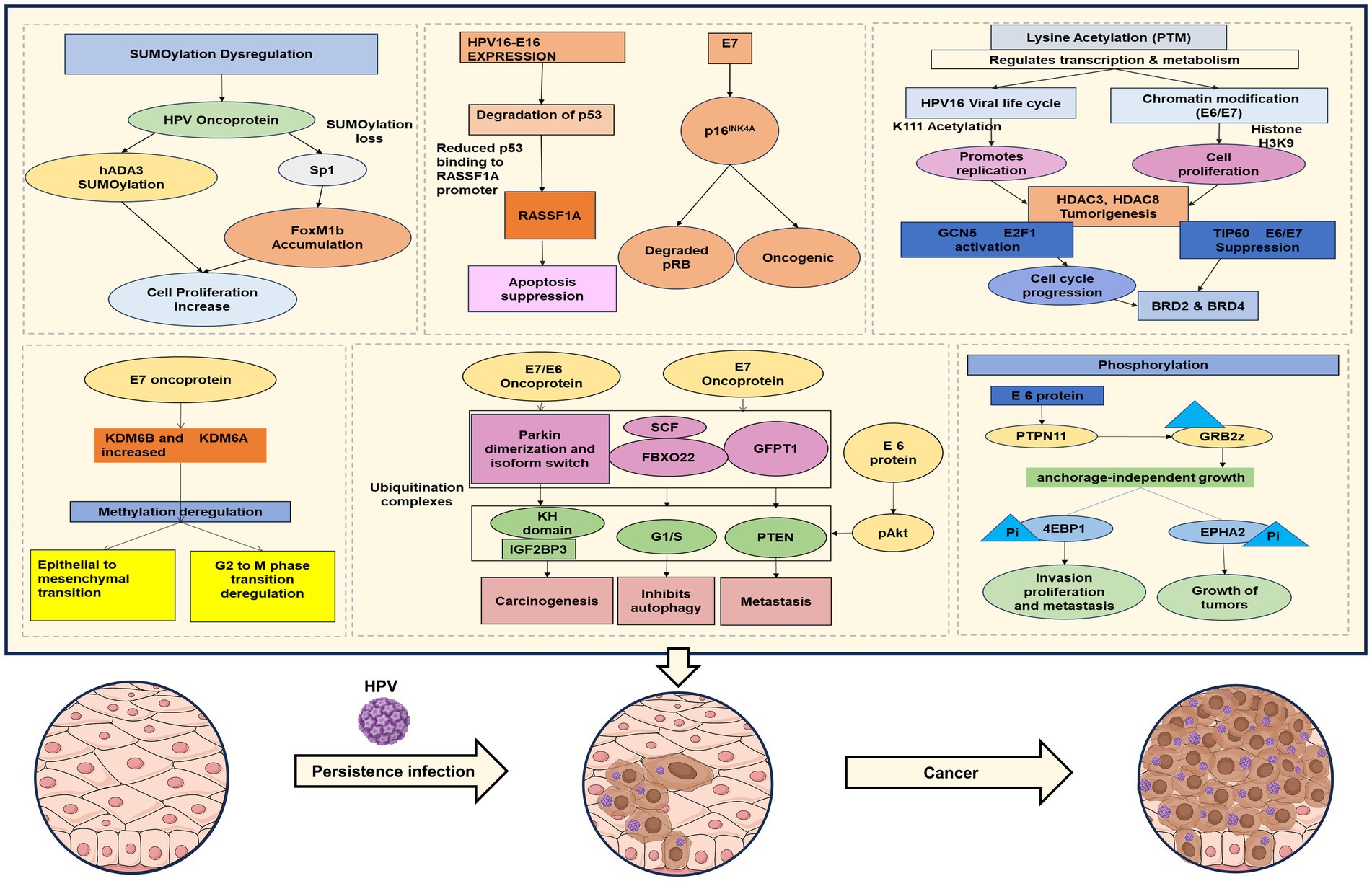 Moreover, HPV16 E7 also interacts with p300/CBP-associated factor (PCAF) histone acetyltransferase, which in turn downregulates IL-8, which helps the cells infected with HPV evade immune response (Huang and McCance, 2002). Mi2β protein in the presence of HPV E7 influences HDAC1/HDAC2, which regulates cell cycle deregulation and immune evasion through the histone modification process and transcription (Basukala and Banks, 2021). There are several other processes also altered, such as SUMOylation, Acetylation, Phosphorylation, and Ubiquitination. Recent research/literature is discussed below in detail.