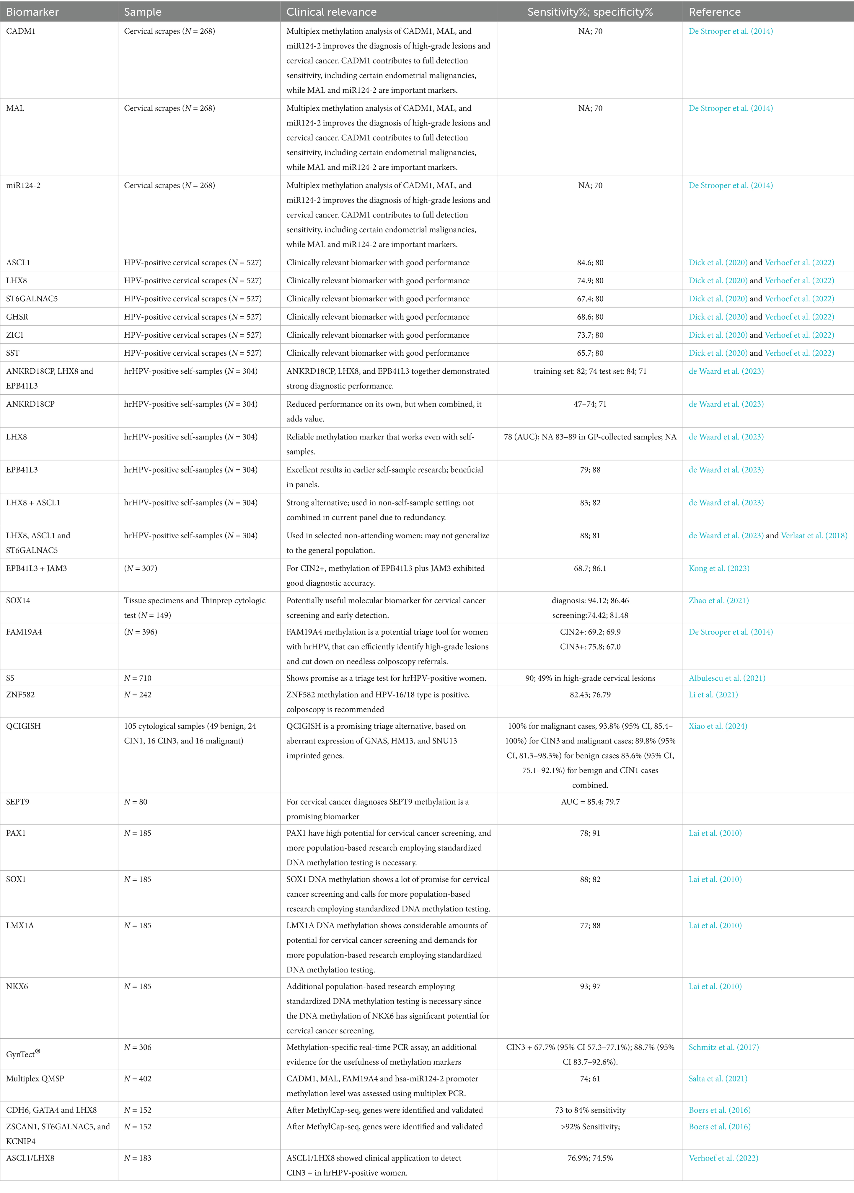 Previous investigations suggested that methylation of the CADM1 and MAL genes may serve as effective biomarkers for identifying cervical intraepithelial neoplasia grades 2 and 3 (CIN2/3), and demonstrating higher sensitivity than traditional cytology-based triage methods (Verhoef et al., 2015). Additionally, epigenetic changes in the form of methylation of the transcription factor ZNF582 have been linked to CIN3 in patients with ASCUS (Burdier et al., 2024), and when it is combined with PAX1, ZNF582 methylation markers have demonstrated potential for detecting high-grade squamous intraepithelial lesions (HSIL) with high sensitivity and specificity (Tian et al., 2017). Apart from this, various genes have been identified with methylation patterns that may serve as promising biomarkers for detecting cervical precursor lesions, such as POUF4 (Castro-Oropeza and Pina-Sanchez, 2022; Pun et al., 2015; Kocsis et al., 2017), ASCL1, LHX8, and ST6GALNAC5 (Verlaat et al., 2018).
