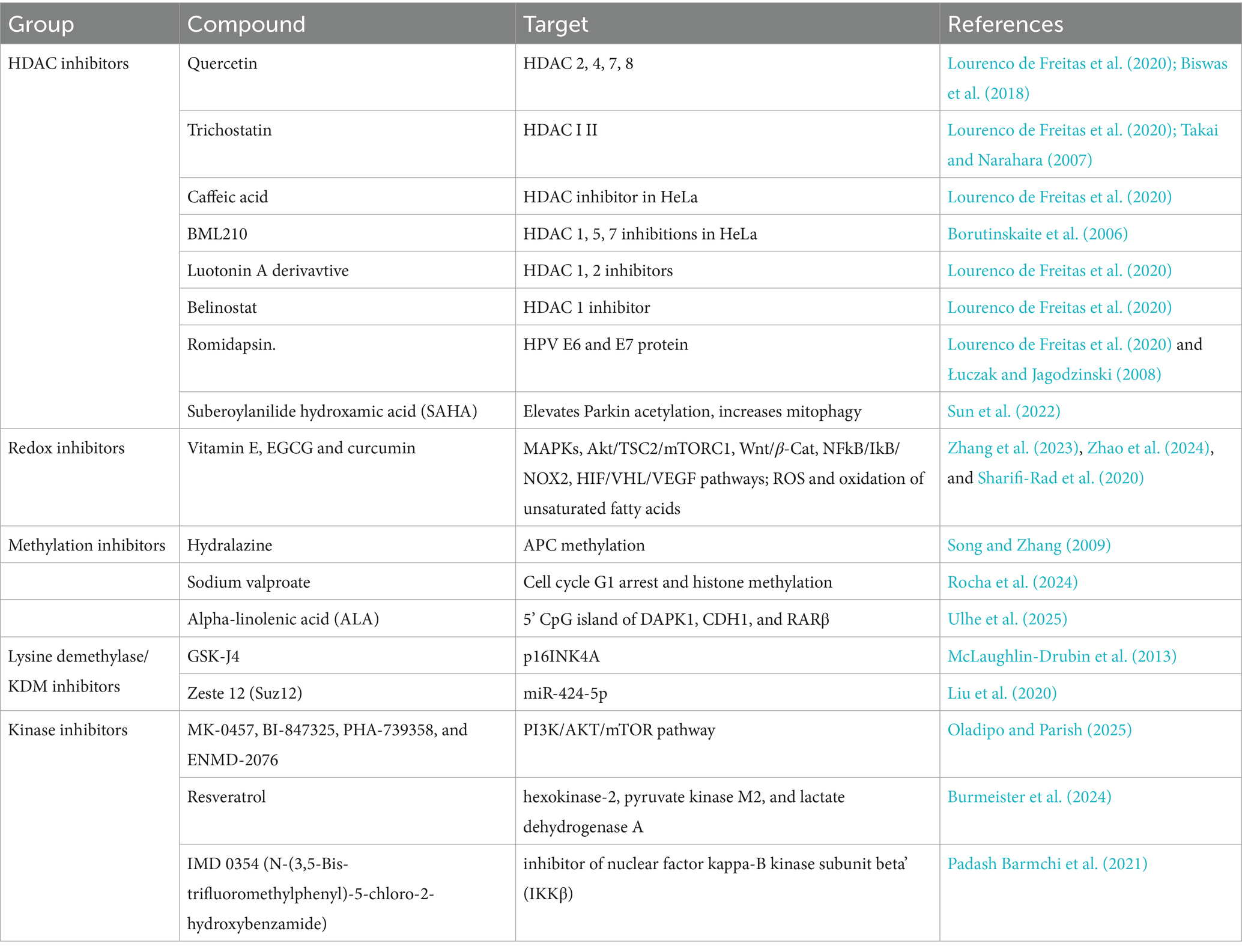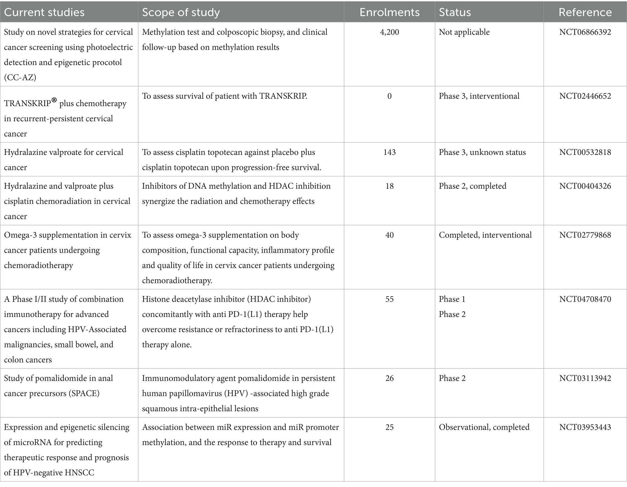 There is growing interest in combining epigenetic drugs with immunotherapy. Epigenetic modulation can enhance expression of tumor-associated antigens, upregulate MHC class I molecules, and induce type I interferon responses, thereby increasing immune recognition of HPV-transformed cells. Early-phase clinical trials are exploring the combination of DNMT inhibitors and HDAC inhibitors with PD-1/PD-L1 checkpoint blockade in HPV-associated malignancies, including cervical cancer (Zhou et al., 2021; Chen et al., 2022). Some therapeutic targets and inhibitors and ongoing trials have been listed in Tables 2, 3, respectively.