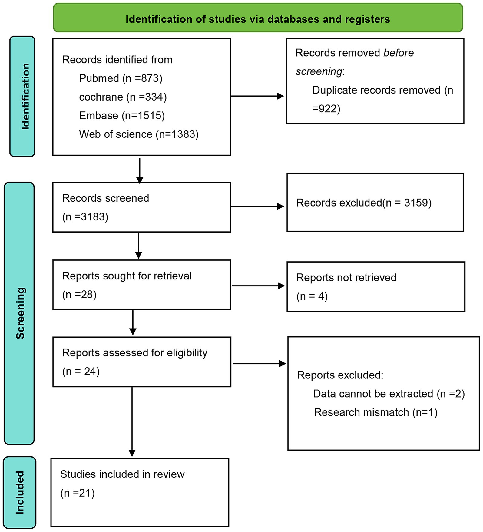 Based on the predefined search strategy, a preliminary search of the databases identified 4,105 articles. After screening titles and abstracts, 922 duplicate entries were excluded, resulting in 3,159 articles being discarded. The remaining 28 articles were subjected to full-text review. Four articles were excluded owing to unavailable full texts, two owing to the inability to extract data, and one due to failure to meet the inclusion criteria. Ultimately, 21 eligible RCTs were included, as shown in Figure 1.