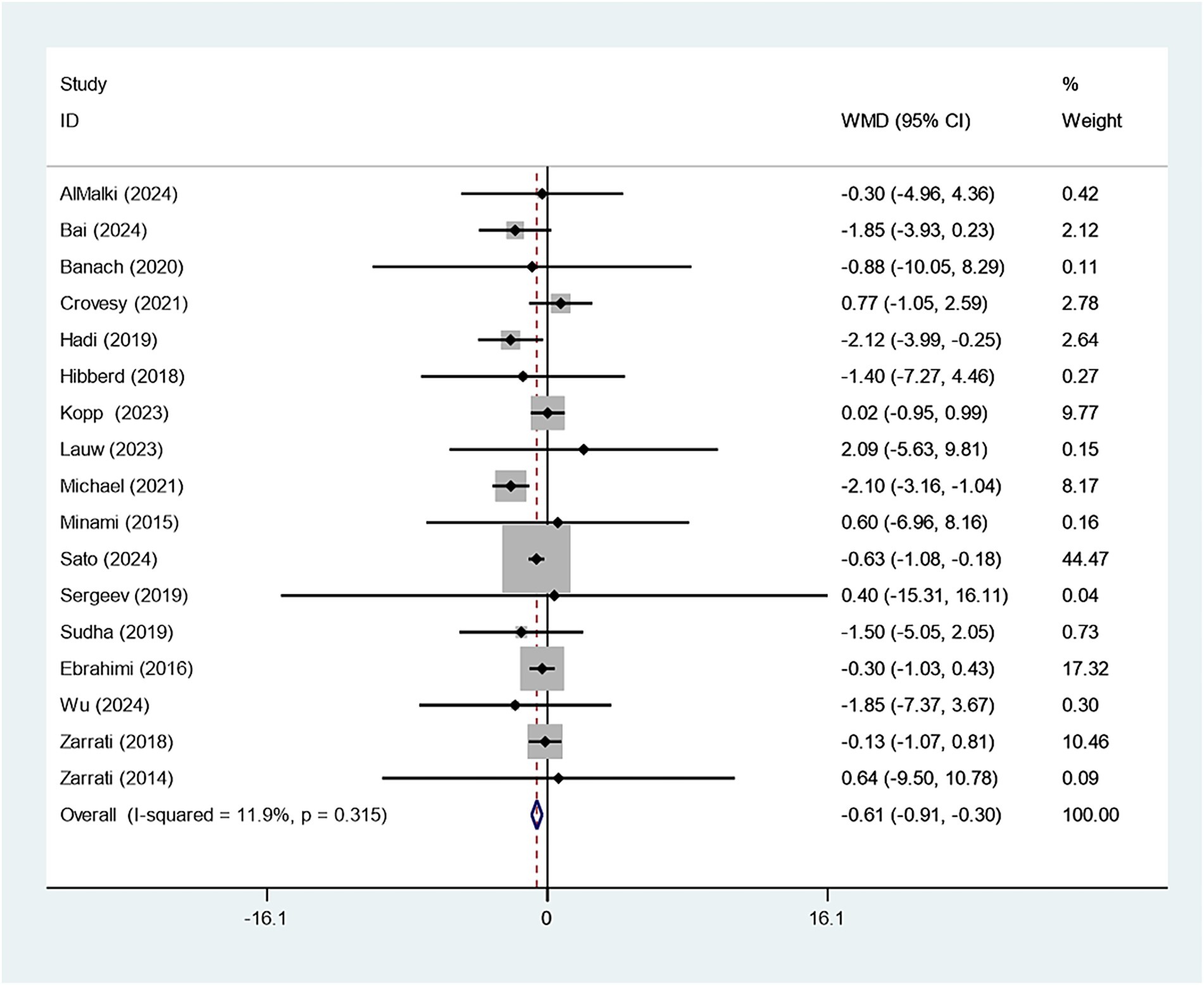 Eighteen studies reported on the relationship between Bifidobacterium supplementation and weight change. Sensitivity analysis demonstrated that the study conducted by Kobyliak had a considerable impact on the overall findings, as illustrated in Supplementary Figure 1. Upon exclusion of this study, the experimental group receiving Bifidobacterium supplementation showed a significantly greater reduction in body weight compared to the control group (WMD: −0.607 kg; 95% CI: −0.910,–0.303; I2 = 11.9%), as shown in Figure 2. Funnel plot symmetry and the Egger test (p = 0.804) suggested no significant publication bias, as presented in Supplementary Figure 2.