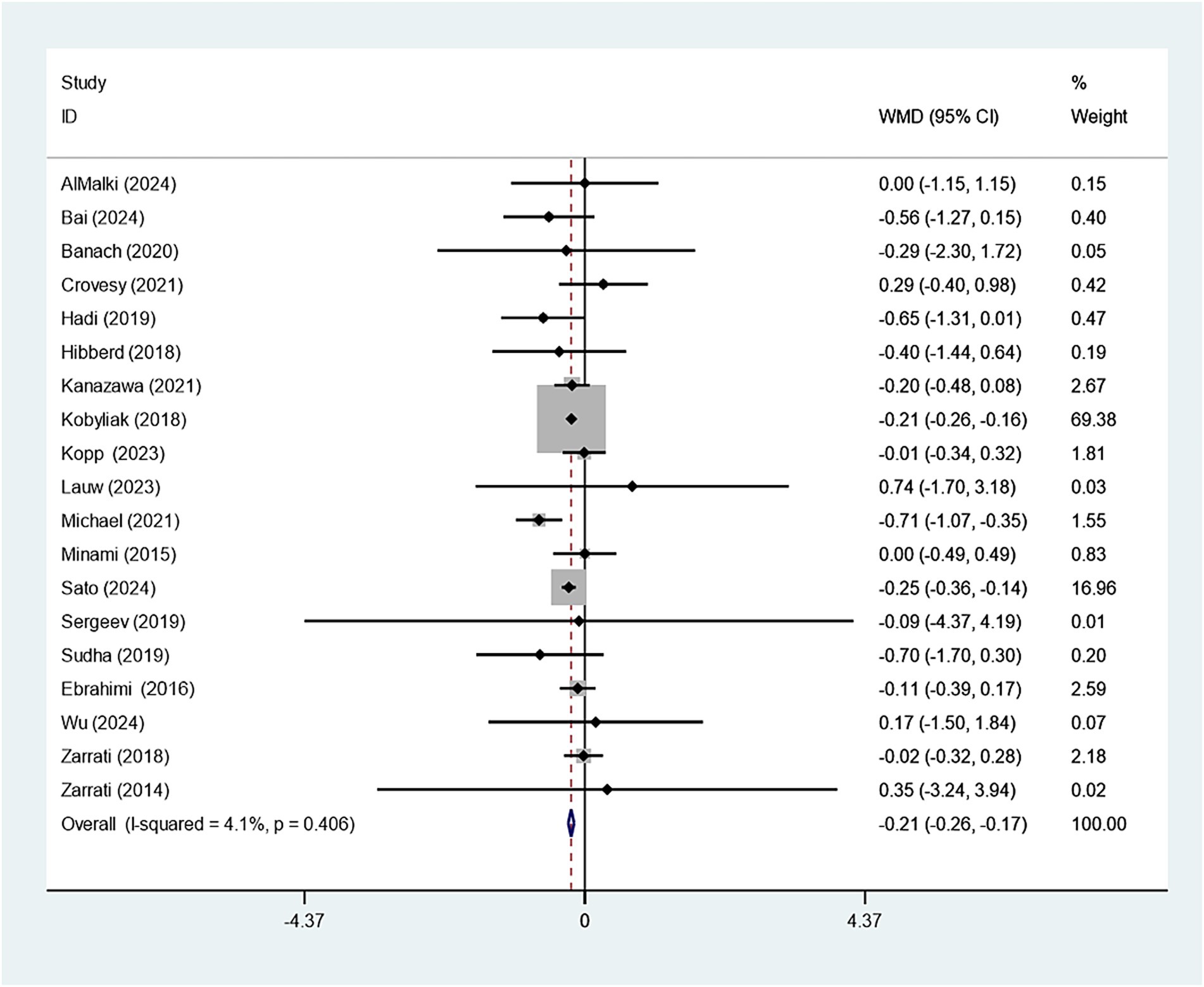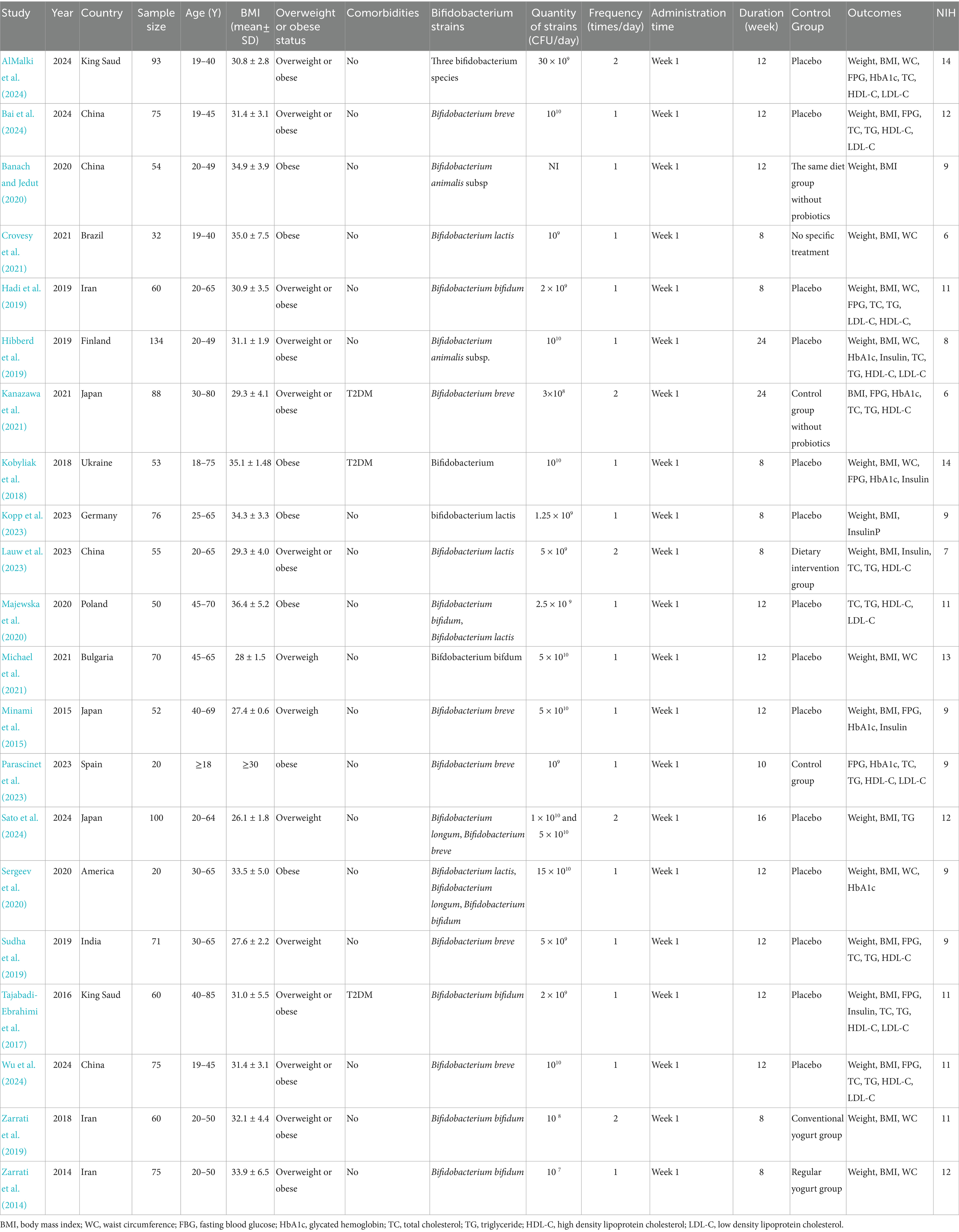 The baseline characteristics of the 21 included RCTs are summarized in Table 2. Of these, 13 (Bai et al., 2024; Sudha et al., 2019; AlMalki et al., 2024; Banach and Jedut, 2020; Hadi et al., 2019; Kanazawa et al., 2021; Lauw et al., 2023; Minami et al., 2015; Sato et al., 2024; Tajabadi-Ebrahimi et al., 2017; Wu et al., 2024; Zarrati et al., 2019; Zarrati et al., 2014) were conducted in Asian countries, 6 (Hibberd et al., 2019; Kobyliak et al., 2018; Kopp et al., 2023; Majewska et al., 2020; Michael et al., 2021; Parascinet et al., 2023) in European countries, and 2 (Crovesy et al., 2021; Sergeev et al., 2020) in the United States and Brazil, respectively. The studies were published between 2014 and 2024 and collectively enrolled 1,392 participants. All studies used BMI as the indicator for overweight or obesity. According to the World Health Organization’s classification (WHO, 2024), overweight was defined as a BMI between 25 and 29.9 kg/m2, while obesity was confirmed by a BMI of 30 kg/m2 or higher. 8 studies (Bai et al., 2024; Sudha et al., 2019; Kanazawa et al., 2021; Minami et al., 2015; Wu et al., 2024; Zarrati et al., 2019; Zarrati et al., 2014; Parascinet et al., 2023) reported the use of Bifidobacterium breve, three studies (Hadi et al., 2019; Tajabadi-Ebrahimi et al., 2017; Michael et al., 2021) used Bifidobacterium longum, five studies (Sato et al., 2024; Kobyliak et al., 2018; Majewska et al., 2020; Sergeev et al., 2020; AlMalki et al., 2024) used a mixed Bifidobacterium species, two studies (Banach and Jedut, 2020; Hibberd et al., 2019) used Bifidobacterium animalis, and three studies (Lauw et al., 2023; Kopp et al., 2023; Crovesy et al., 2021) used Bifidobacterium lactis. The NIH quality assessment indicated that 11 studies (Bai et al., 2024; AlMalki et al., 2024; Sato et al., 2024; Tajabadi-Ebrahimi et al., 2017; Wu et al., 2024; Zarrati et al., 2019; Zarrati et al., 2014; Kobyliak et al., 2018; Majewska et al., 2020; Michael et al., 2021; Crovesy et al., 2021) had low risk of bias, while 10 studies (Sudha et al., 2019; Banach and Jedut, 2020; Kanazawa et al., 2021; Lauw et al., 2023; Minami et al., 2015; Hibberd et al., 2019; Kopp et al., 2023; Parascinet et al., 2023; Crovesy et al., 2021; Sergeev et al., 2020) exhibited moderate risk of bias, as detailed in Supplementary Table 1.