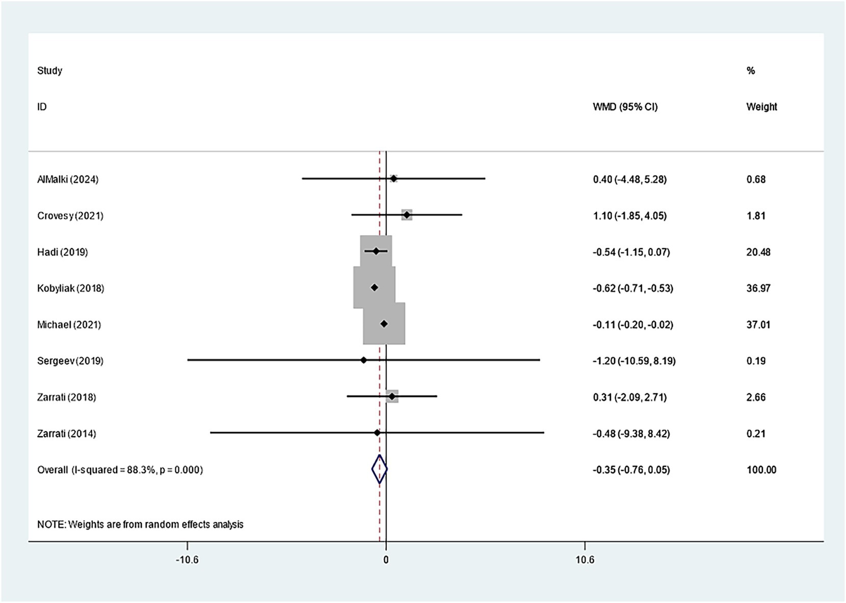 The primary outcomes assessed in this meta-analysis were: weight, BMI, as well as waist circumference (WC). Secondary outcomes encompassed fasting blood glucose (FBG), glycated hemoglobin (HbA1c), insulin, total cholesterol (TC), triglycerides (TG), high-density lipoprotein cholesterol (HDL-C), and low-density lipoprotein cholesterol (LDL-C).