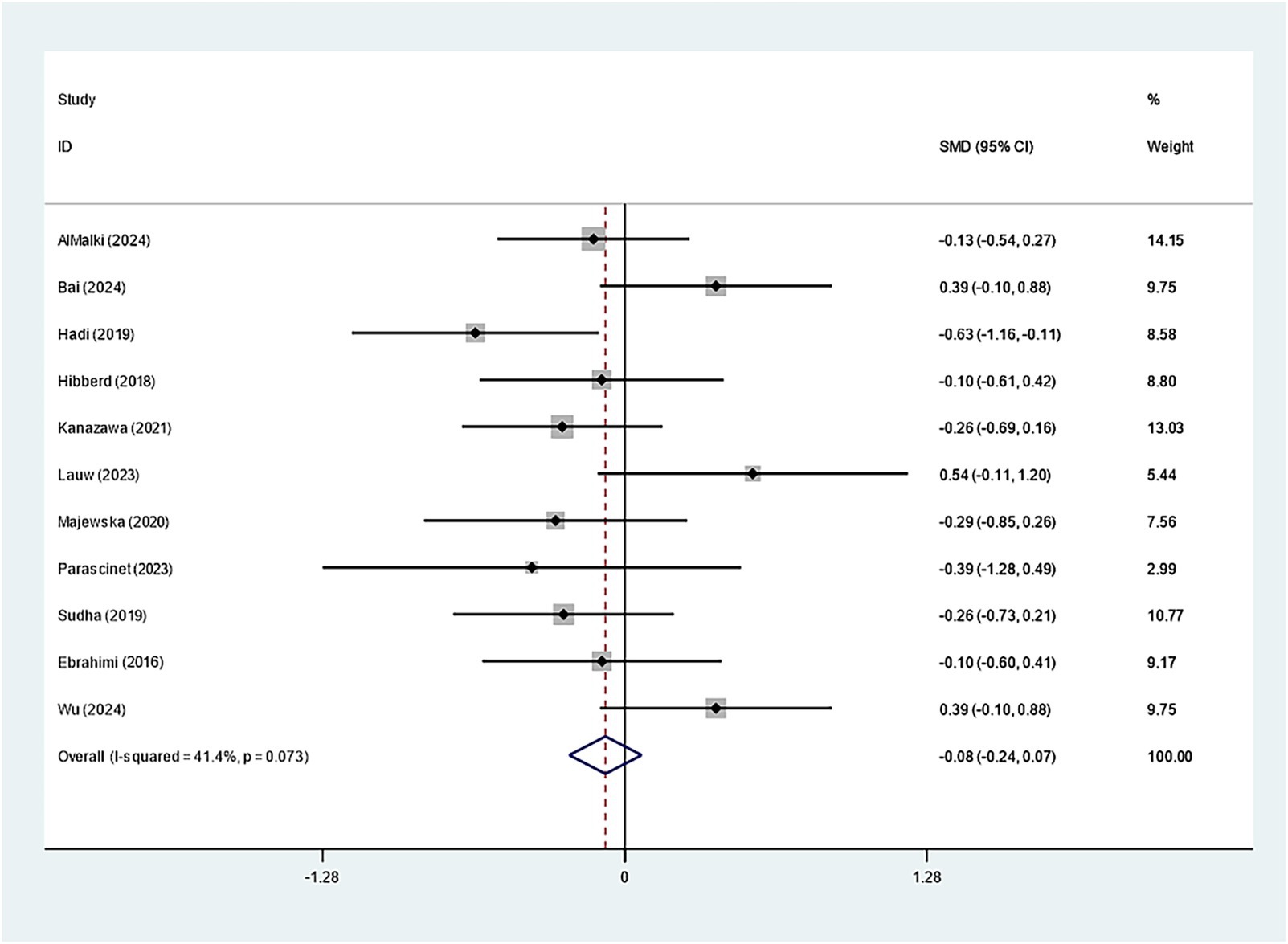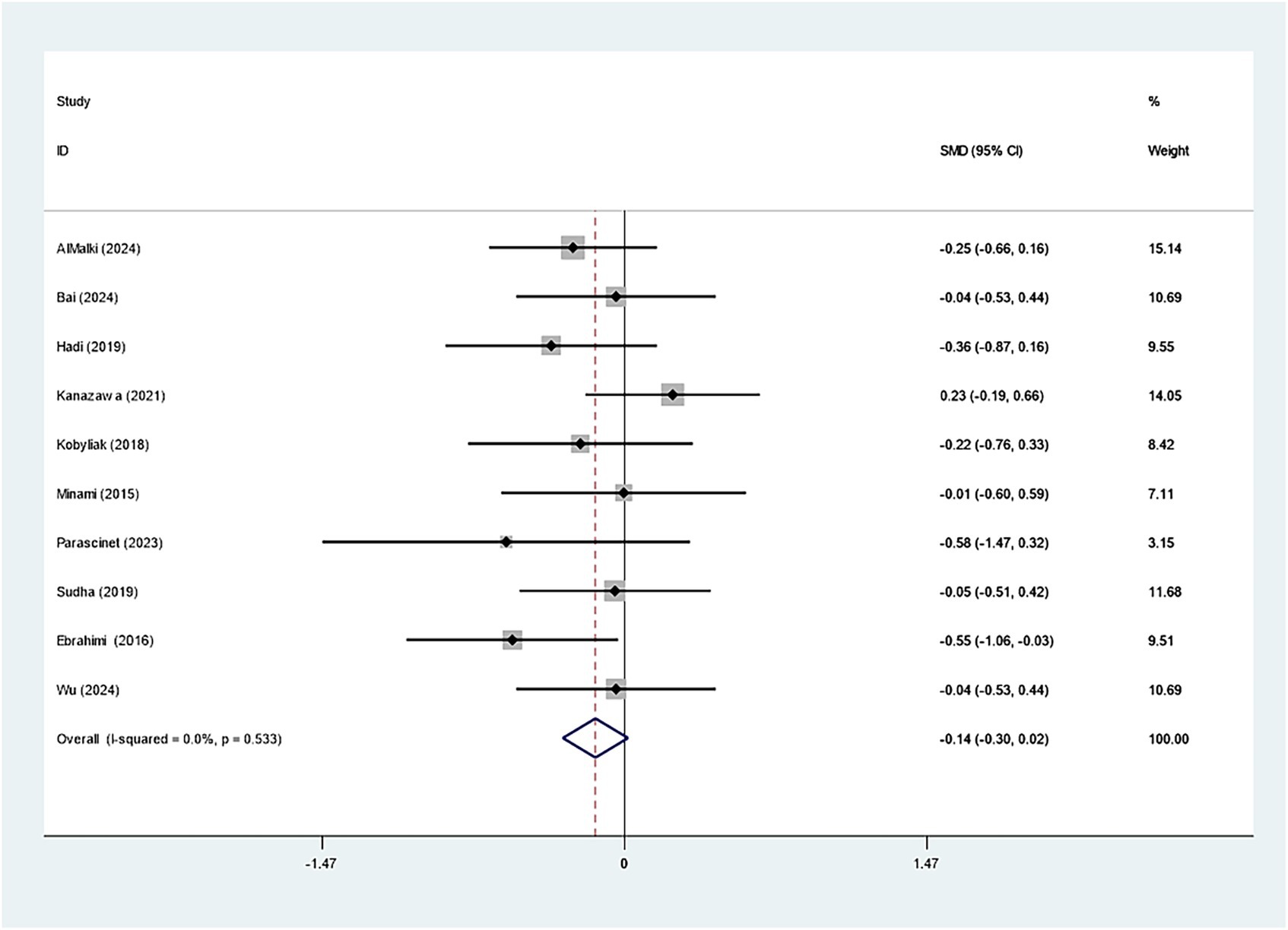 Ten studies evaluated how Bifidobacterium supplementation influences FBG within the cohort with excess weight or obesity. Bifidobacterium did not markedly affect FBG (SMD: -0.143; 95% CI: −0.302, −0.016, I2 = 0.0%) (Figure 5). Our sensitivity analysis indicated robustness. Egger’s test (p = 0.215) and the funnel plot demonstrated no publication bias, as depicted in Supplementary Figures 6, 7.