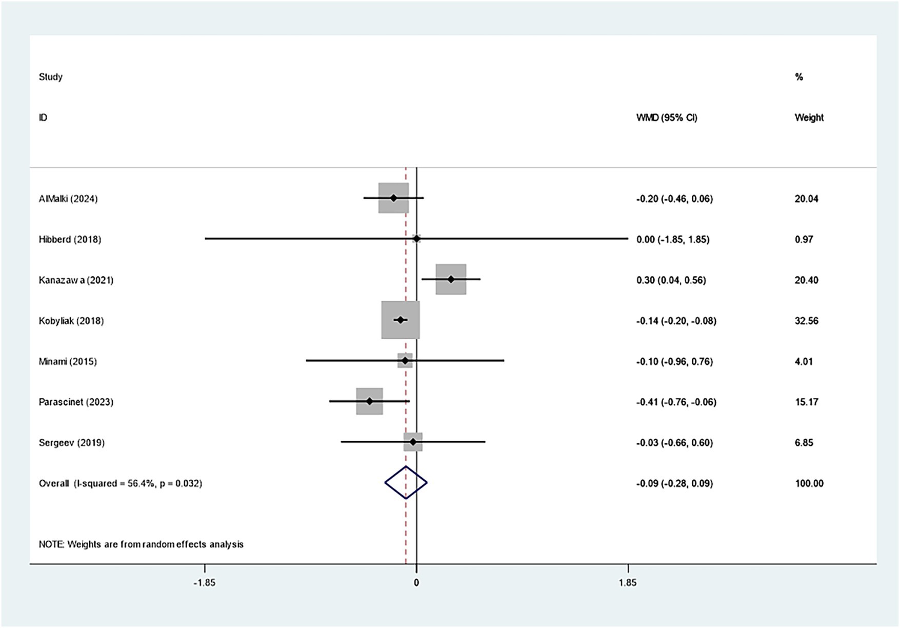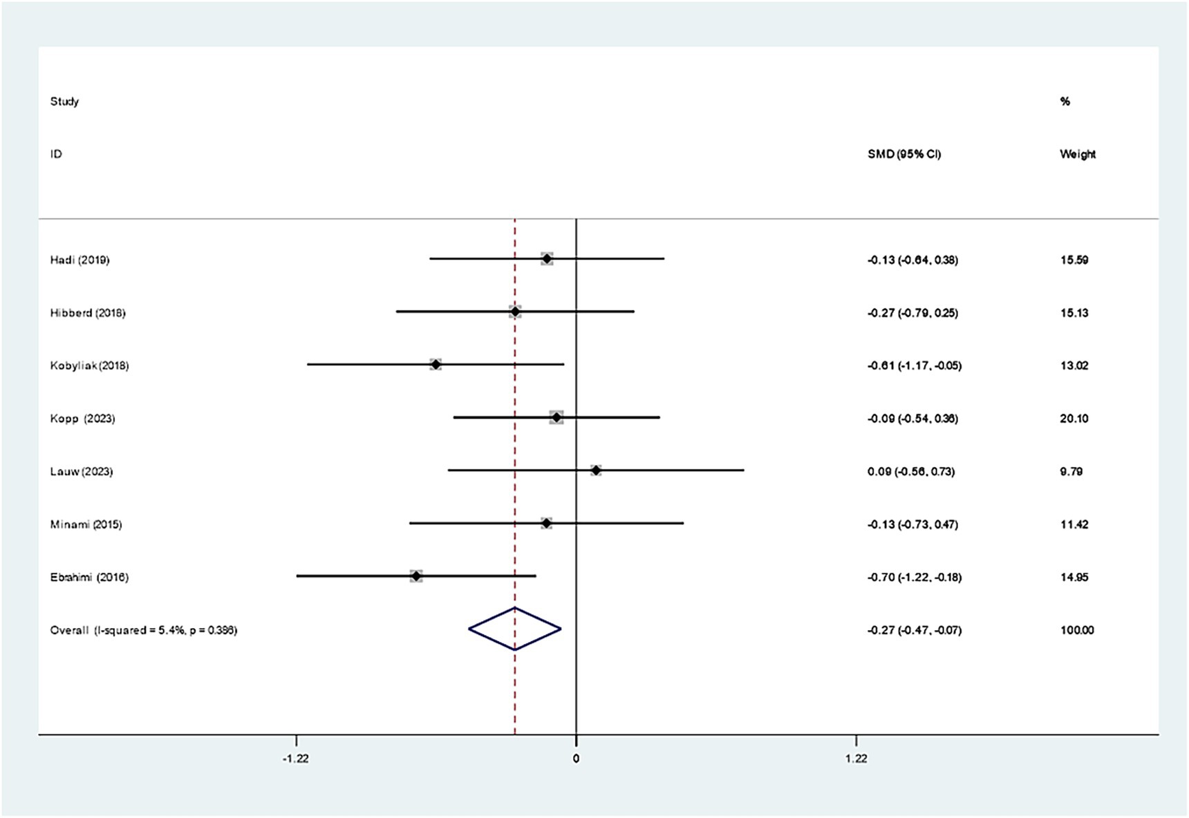 Seven studies investigated the effect of Bifidobacterium on HbA1c, demonstrating insignificant variations across groups (WMD: −0.093%; 95% CI: −0.277, −0.091, I2 = 56.4%) (Figure 6). However, regarding insulin levels, seven studies reported a notable decrease in insulin levels in the Bifidobacterium supplementation cohort (SMD: −0.268; 95% CI: −0.470, −0.066, I2 = 5.4%) (Figure 7). These findings were robust after sensitivity analysis, as presented in Supplementary Figures 8, 9.