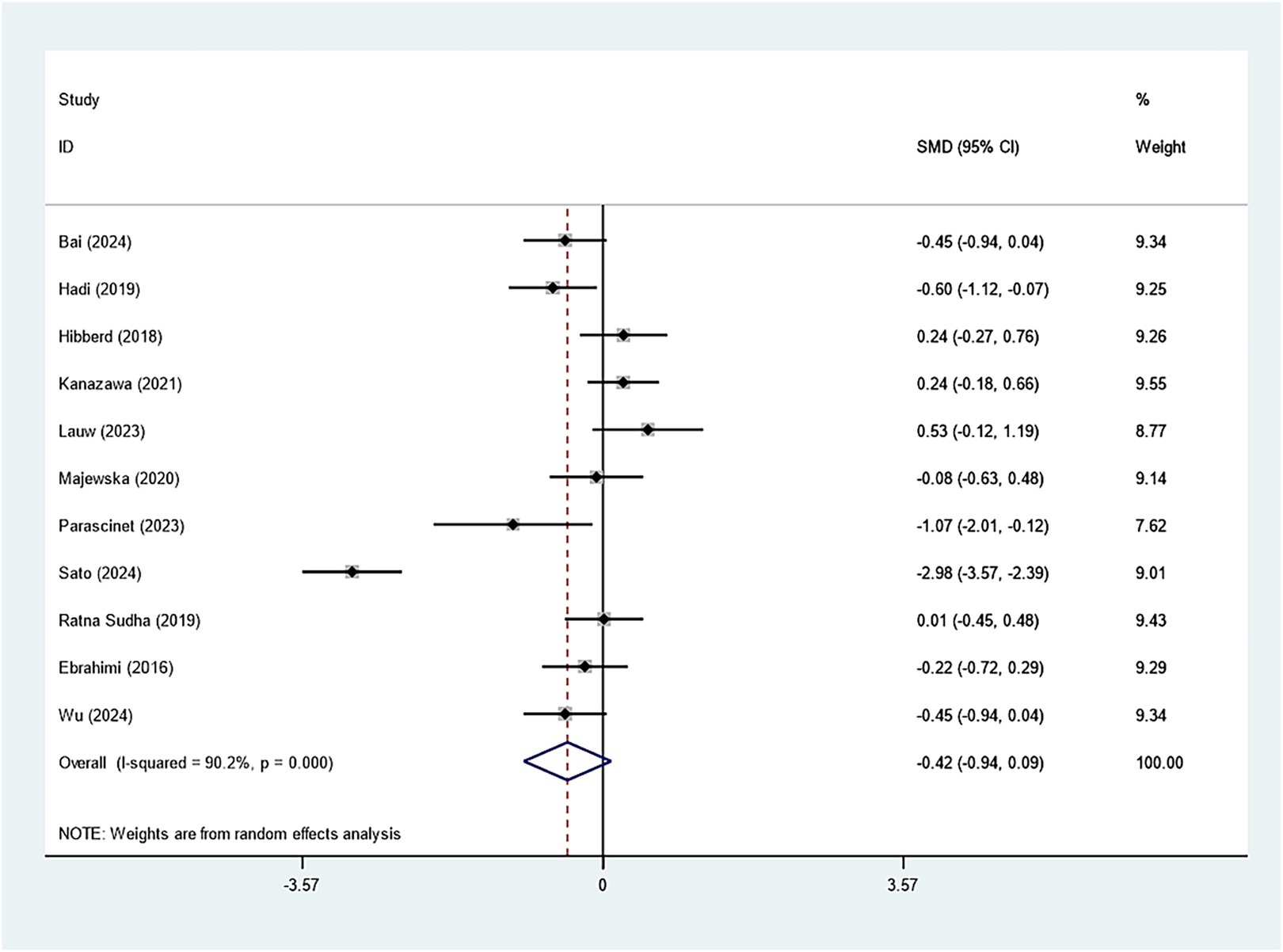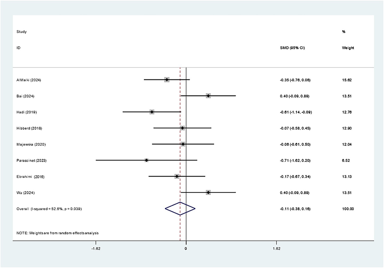 Eight studies examined the impact of Bifidobacterium on LDL-C and revealed no evident effect (SMD: -0.108; 95% CI: −0.379, 0.162, I2 = 52.6%) (Figure 11). Sequential exclusion of individual studies in sensitivity analyses did not markedly affect the results, as presented in Supplementary Figure 16.