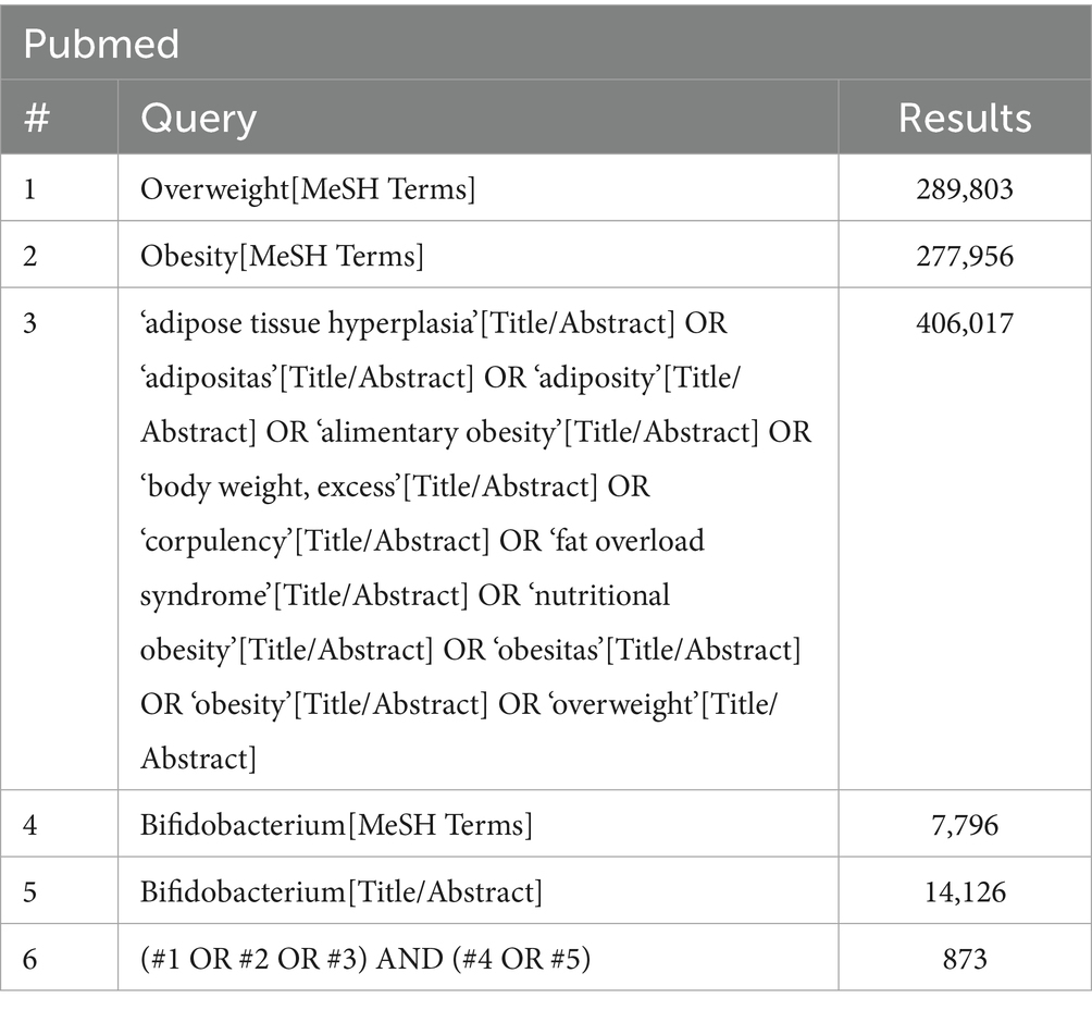 A comprehensive literature search was performed in four online databases (PubMed, Embase, Cochrane Library, and Web of Science) to identify RCTs. The search covered the period from database inception to December 3, 2024. Keywords such as “Bifidobacterium,” “obesity,” and “overweight” were used as both subject terms and free words in the search. The search strategy is presented in Table 1. The references of prior systematic reviews were also checked for eligible RCTs.