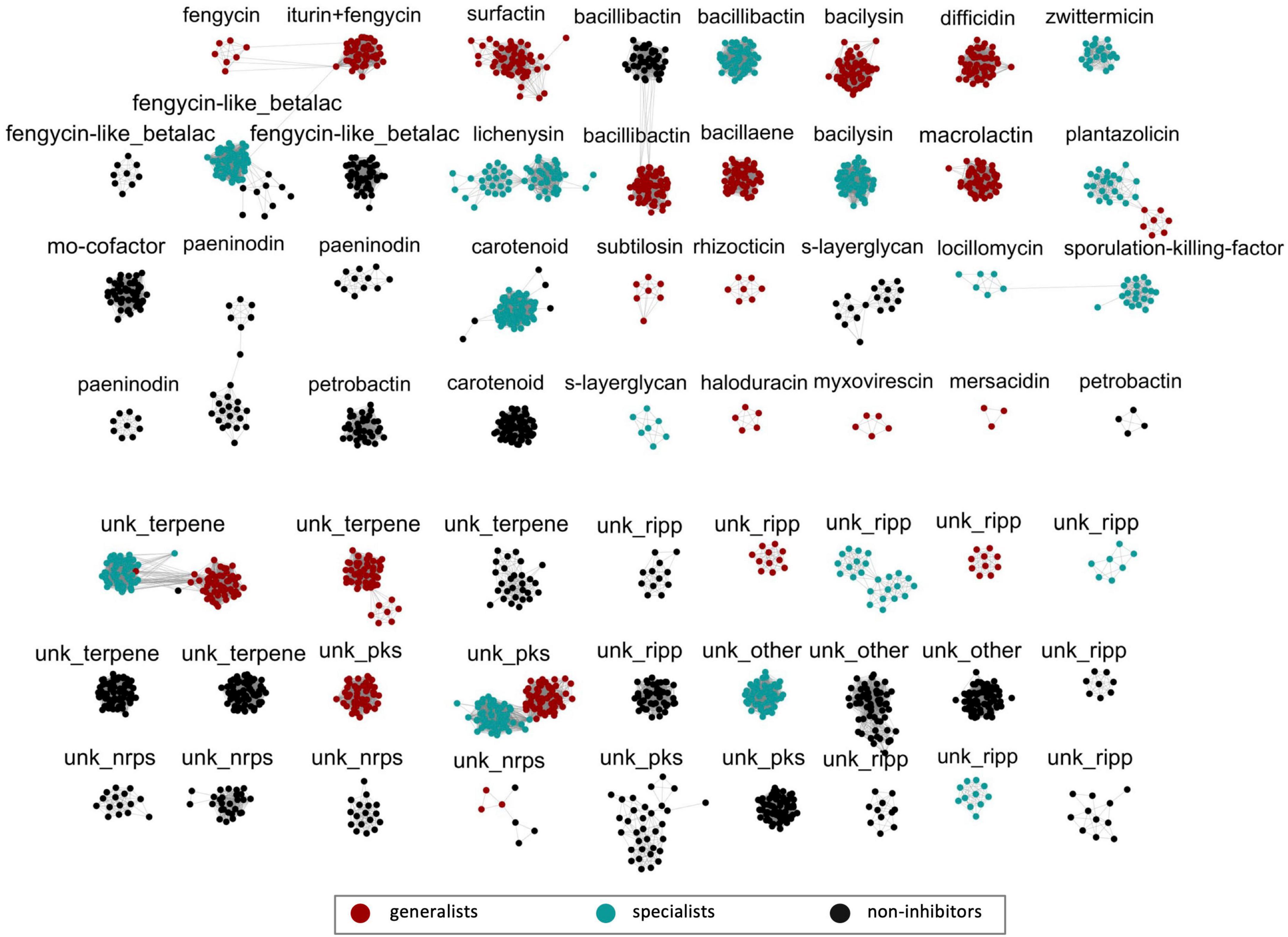 Figure 4. Similarity analysis of Bacillaceae biosynthetic gene clusters (BGCs). All 2,446 BGCs identified were grouped based on the distance matrices of gene cluster estimated by BiG-SCAPE (v.0.0.0r) (Navarro-Muñoz et al., 2020) analysis. Clusters containing three or more nodes (2,055 BGCs) are shown here and each cluster is labeled according to the secondary metabolite predicted by antiSMASH v.5 (Blin et al., 2019). An image including all 2,446 BGCs can be found in Supplementary Figure 3. The color of nodes is according to the breadth of observed antibiosis activity (generalist – red; specialist – teal; non-inhibitor – black) for the strain containing the BGC identified. The diversity of BGCs connected with fengycin and surfactin/lichenysin production are located in the top-left corner of the figure. Abbreviations for cluster labels are as follows: fengycin-like betalactone (fengycin-like_betalac), molybdenum cofactor (mo-cofactor), unknown RiPP (unk_ripp), unknown NRPS (unk_nrps), unknown PKS (unk_pks), and unknown Other BGC (unk_other).
