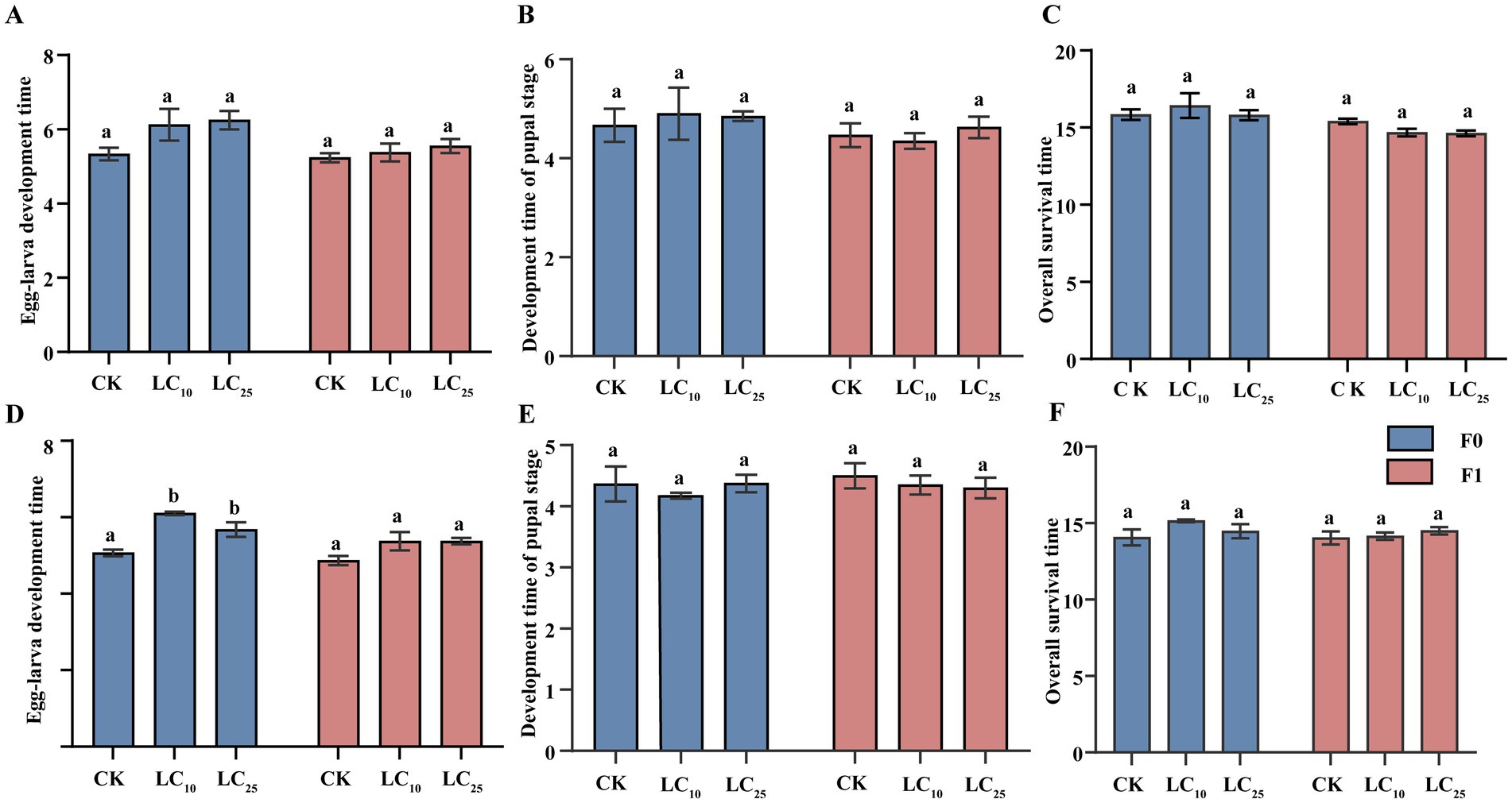 Figure 1. Effect of sublethal concentrations of fipronil on two consecutive generations of B. communis. F0, parental generation; F1, offspring of exposed insects. (A-C) Effects of direct exposure to fipronil on B. communis. (D-F) Effects of indirect exposure to fipronil on B. communis. Data are presented as the Mean ± SE, LSD test, with different lowercase letters denoting significant differences between treatments (p < 0.05).