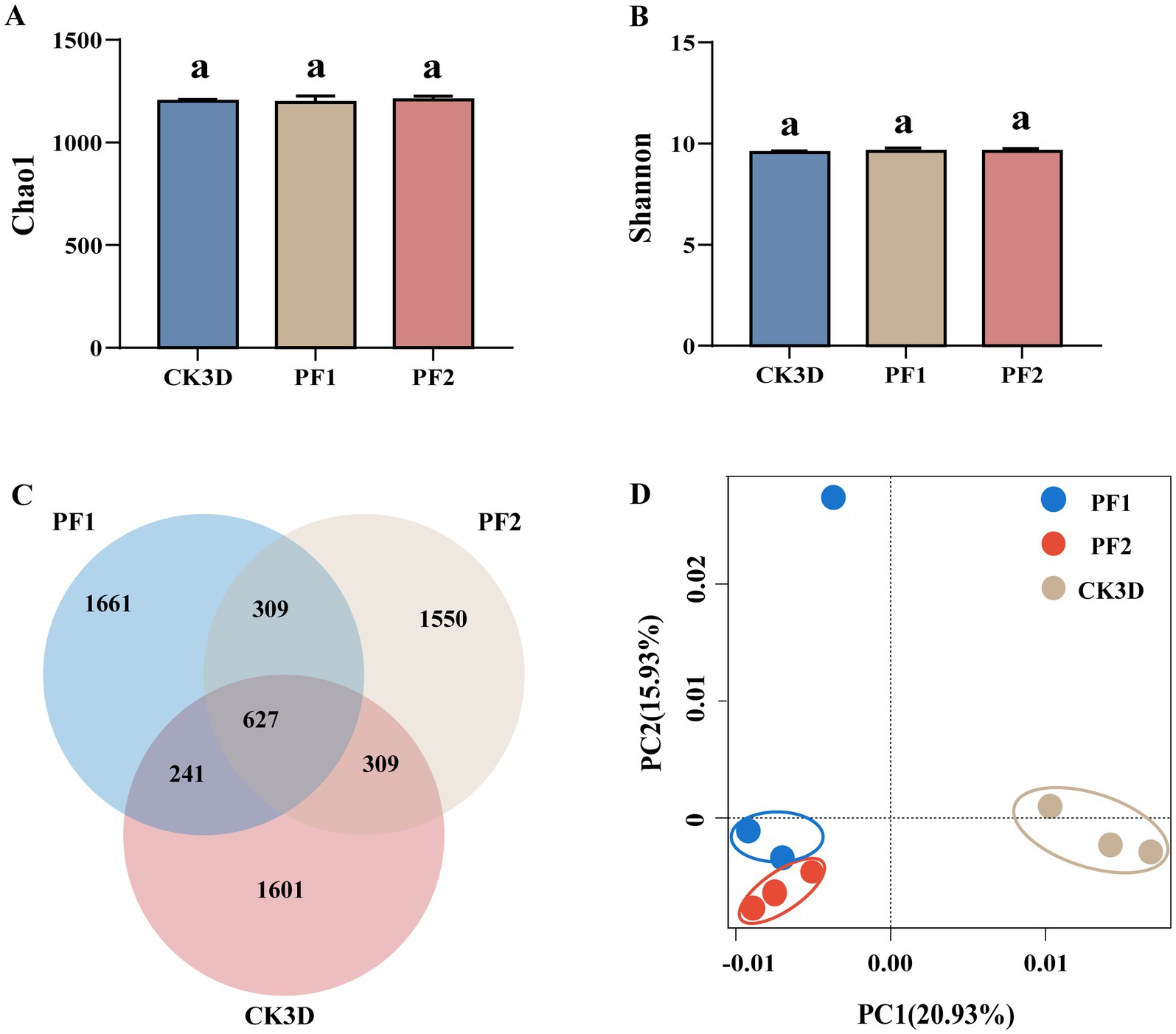Figure 2. B. communis larval symbiotic bacterial community dynamics. (A,B) Boxplot of α-diversity measured by the second indexes. Letters indicate differences based on LSD test following one-way ANOVA. Different letters indicate significant differences (P < 0.05). (C) OTU Venn diagram analysis in different samples. (D) Principal component analysis (PCA) between different subgroups of samples.
