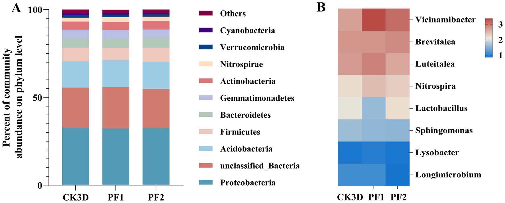 Figure 3. Bacterial composition of larval B. communis. (A) Relative abundance of the bacterial community at the phylum level. (B) Heat map analysis of the bacterial community at the genus level.