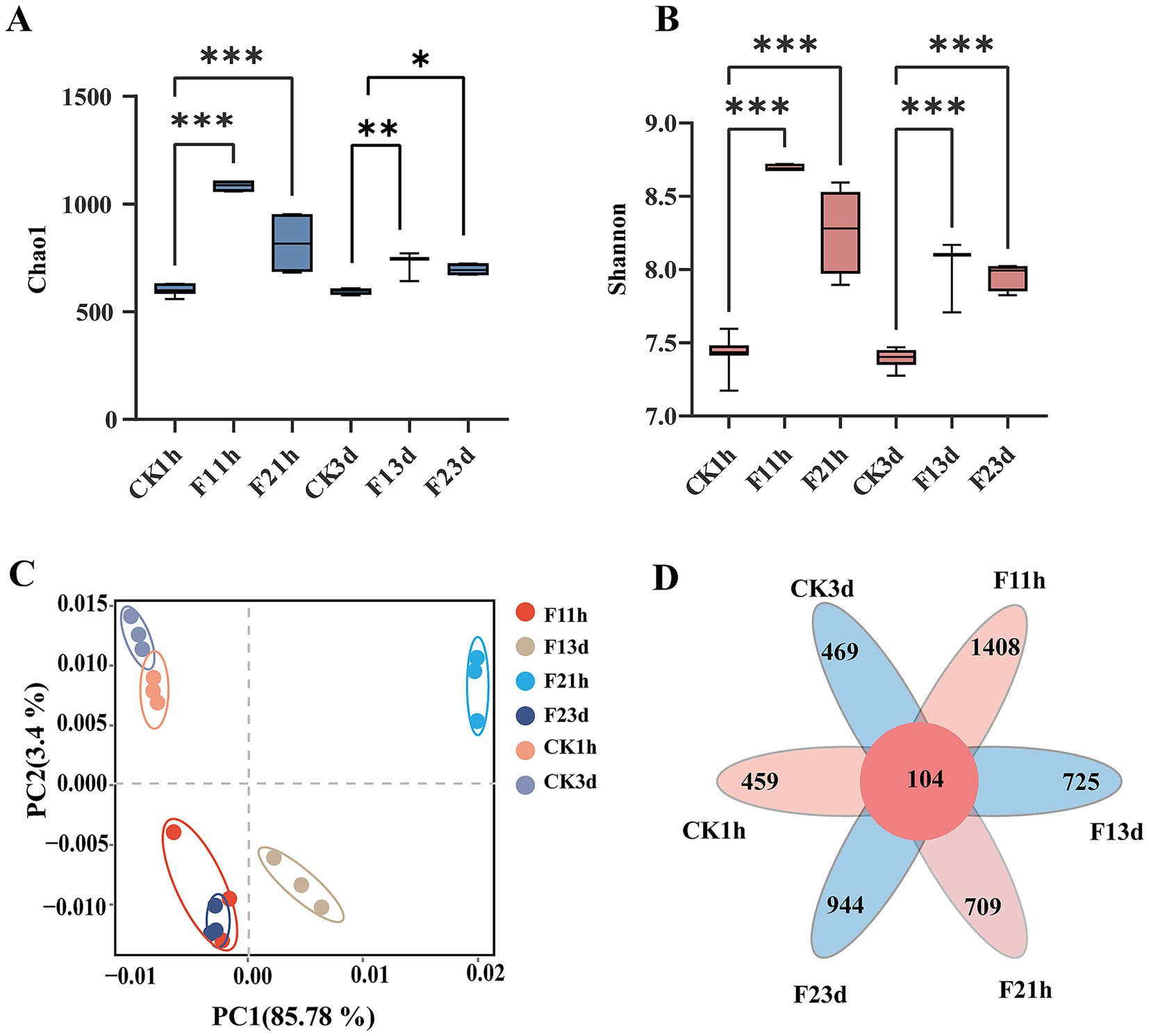 Figure 4. Bacterial community dynamics in adult B. communis symbionts. (A,B) Box plots of alpha diversity measured by second indices (Letters indicate differences based on LSD test following ANOVA. Data are presented as mean ± SE, *P < 0.05, **P < 0.01, ***P < 0.001). (C) Principal component analysis (PCA) between samples from different subgroups. (D) OTU Venn diagram analysis of different samples.