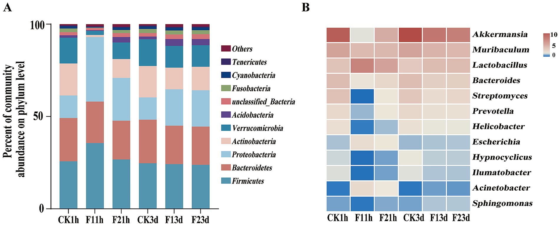 Genus-level analysis revealed treatment-dependent shifts in dominant taxa, with alterations in community structure occurring 1 h after exposure. (Figure 5B). While Akkermansia remained most abundant in controls (1 h: 13.33%; 3 d: 14.98%), fipronil exposure prompted Lactobacillus dominance after 1 h (LC10: 10.02%, LC25: 7.52%). Both Lactobacillus and Escherichia showed significantly elevated abundances in 1 h treatments (CK1h: 4.84, 1.37%, p < 0.001). Streptomyces was lower than that of the control group (5.01%). After 3 d exposure, Akkermansia dominance persisted, while the relative abundance of Lactobacillus was significantly higher than in controls (4.42%, p < 0.01). Concentration-dependent decreases were observed for Akkermansia (11.17 to 11.43%), Muribaculum (6.12 to 5.85%). The opposite was true for Bacteroides (3.98 to 4.05%) and Streptomyces (2.96 to 3.34%, p < 0.01).