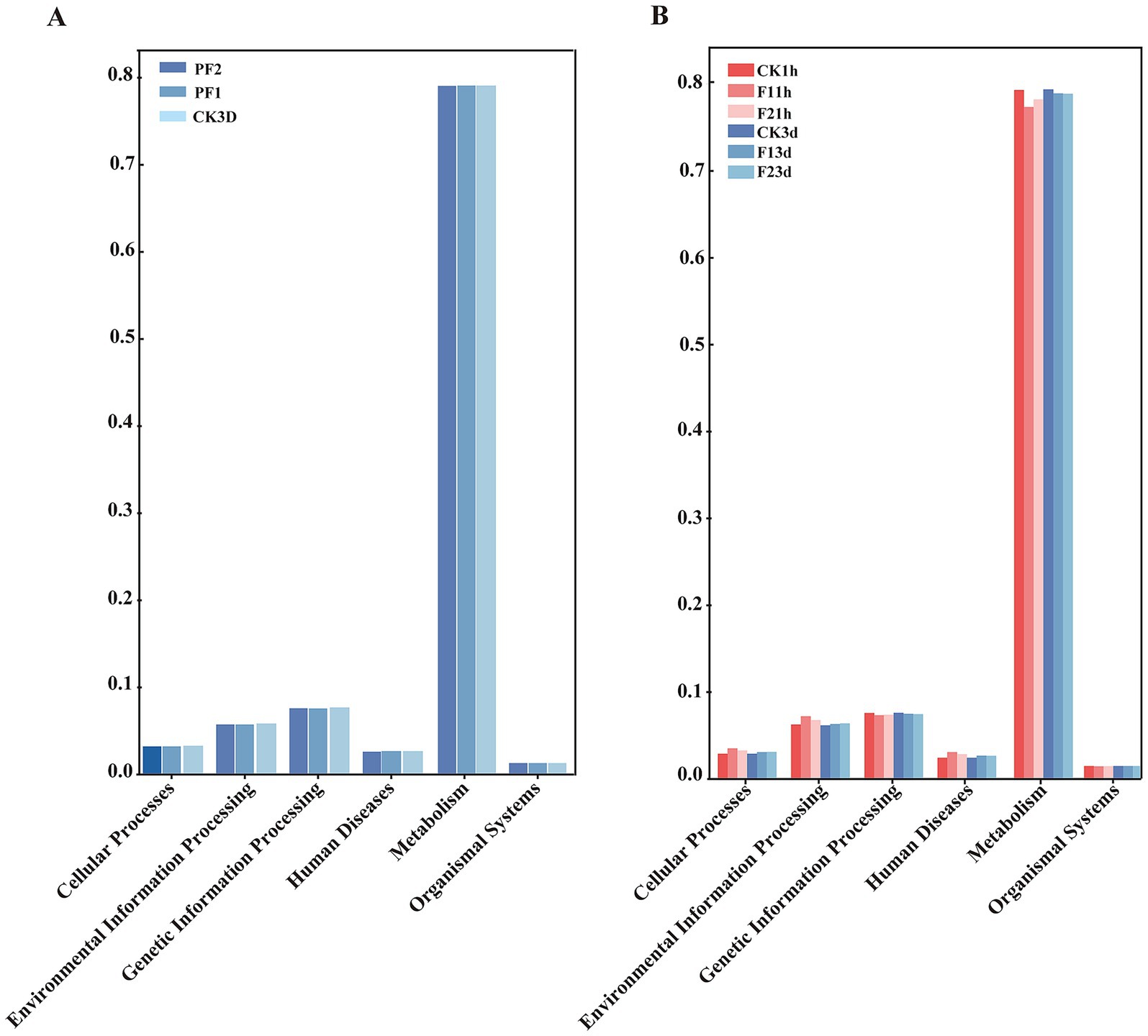 Figure 6. Functional analysis prediction. According to PICRUSt 2 function prediction, symbiotic bacteria in B. communis are primarily enriched in the top 6 biological KEGG functions. (A) B. communis larval. (B) Adult B. communis.