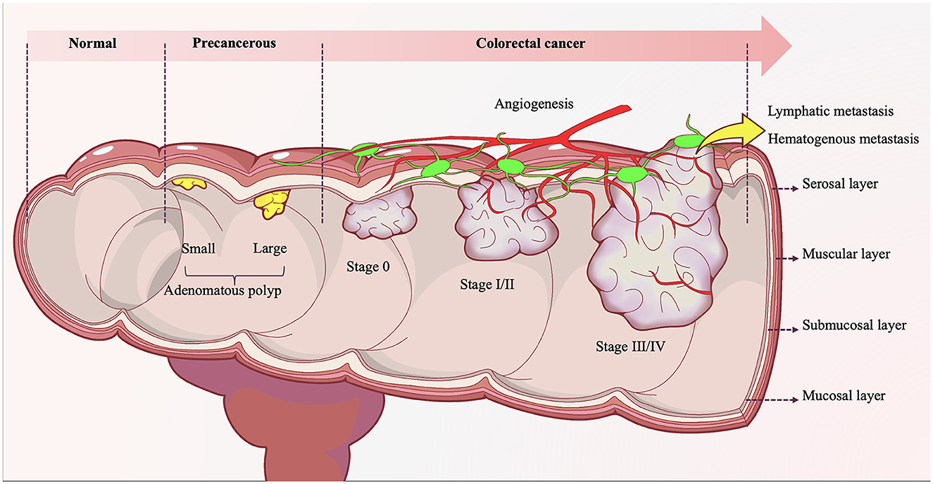 Figure 2. The evolution of colorectal adenoma-carcinoma progression. Under the long-term synergistic effects of both intrinsic and extrinsic pathogenic factors, the normal colonic mucosal epithelium initially undergoes atypical hyperplasia, characterized by abnormally accelerated proliferation rates, architectural disorganization, and loss of cellular polarity. With progressive injury accumulation, the mucosal epithelium evolves into precancerous lesions such as tubular adenomas, villous adenomas, or tubulovillous adenomas. During the adenomatous stage, accumulating genetic mutations drive progression from low-grade to high-grade intraepithelial neoplasia, marked by significantly enhanced cytological atypia and emerging invasive potential. Upon breaching the basement membrane and infiltrating the submucosa and deeper tissues—concomitant with acquired capabilities for vascular and lymphatic invasion—the adenomatous lesion ultimately completes its malignant transformation into colonic adenocarcinoma.