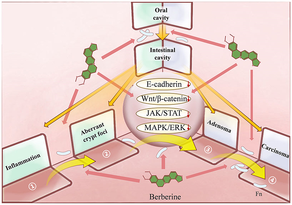 In this review, we summarize the sequential effects of BBR on the Fn-induced intestinal adenoma-carcinoma cascade from a dynamic perspective and its regulatory mechanism in the occurrence of CRC for the first time. This study is expected to provide preclinical evidence for the use of BBR in the prevention and treatment of CRC, and the development of related new drugs will further reduce the incidence and mortality of CRC.