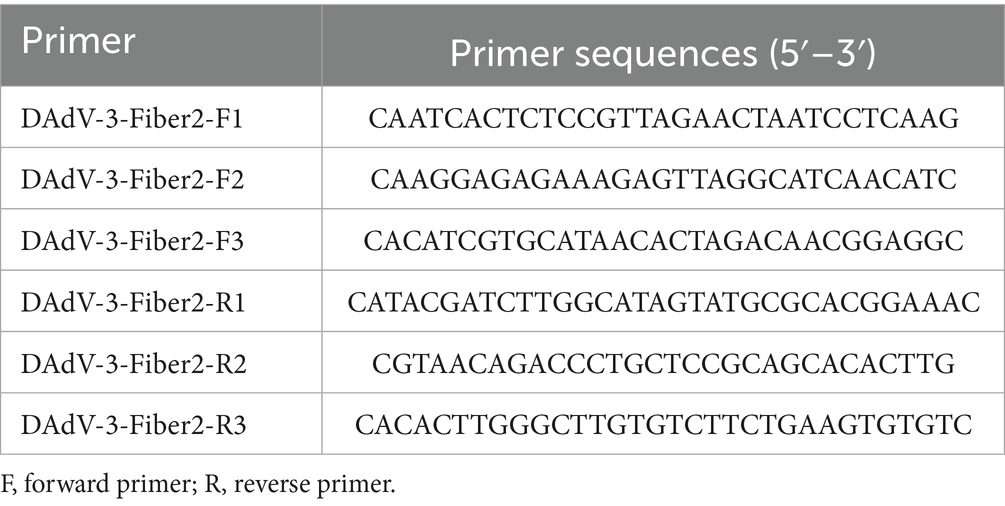 Thus, to address the limitations of existing methods, in this study, based on a DAdV-3 strain (CH-AN-2022) isolated by our research group, DAdV-3-fiber-2 was used as the target gene to establish a visual fluorescent RPA-LFD rapid detection assay for clinical prevention and control of the virus.
