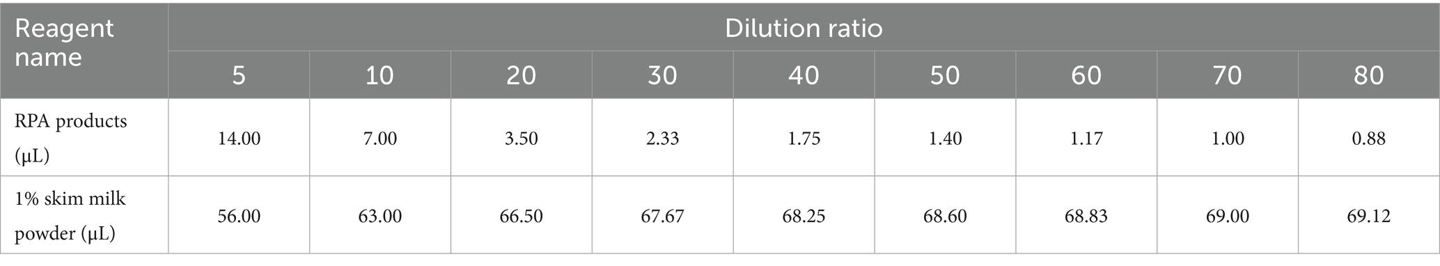 Highly viscous amplification products must be appropriately diluted to allow testing of the target gene amplification products. At the end of the reaction, the RPA amplification products were diluted 5-, 10-, 20-, 30-, 40-, 50-, 60-, 70-, and 80-fold in 1% skim milk powder (Table 2).