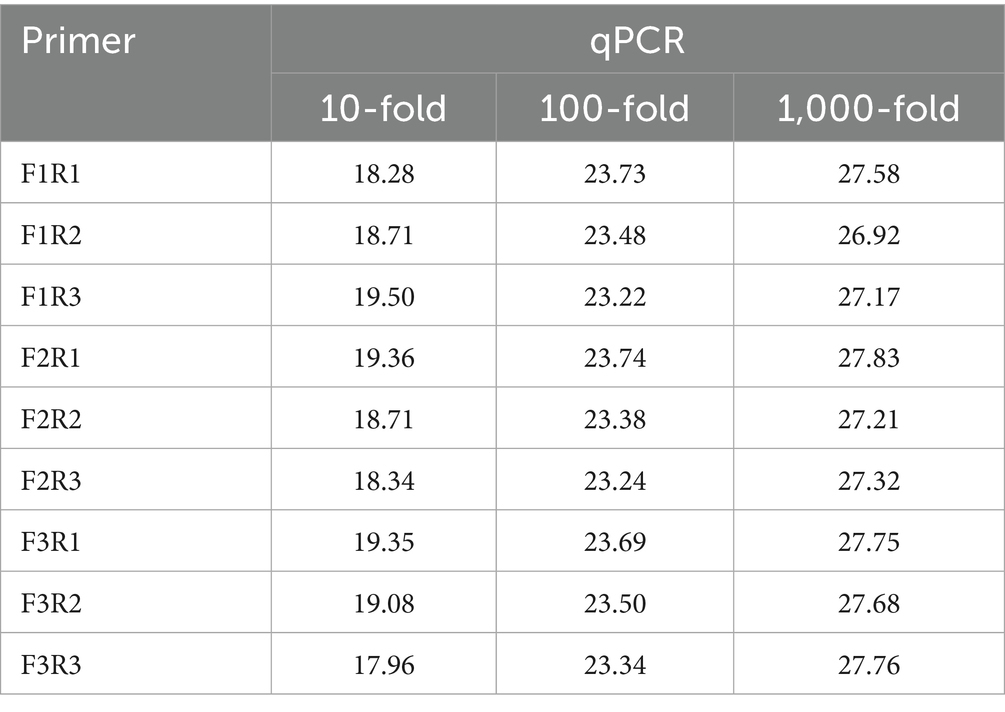 Furthermore, 10-, 100-, and 1,000-fold DNA dilutions were used as templates, and qPCR was used to evaluate the primers. The amplification efficiencies of the different primers are shown in Table 4. When F1/R1 was used as the primer pair, the amplification efficiency was the highest. Analysis of the melting curves revealed that F1/R2 and F3/R3 showed non-specific amplification (Figure 2B). Nine primer pairs were used to amplify the gene product using RPA, and the results showed that the amplified products of F1/R1, F2/R1, F3/R3, and F3/R1 showed the clearest bands on the dipsticks.