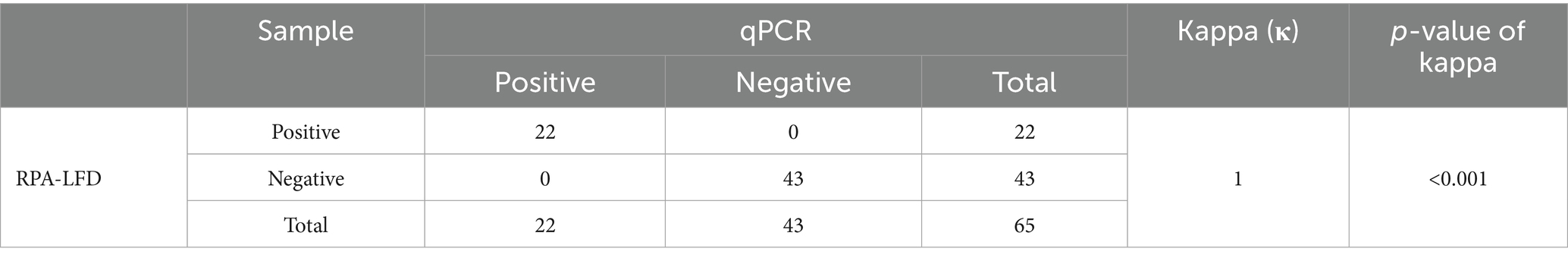 To evaluate the concordance rate between the RPA-LFD assay and qPCR, 65 cloacal samples collected from three duck farms with clinical outbreaks were tested using both the established RPA-LFD assay and qPCR, and their results were compared. The qPCR assay was performed following a previously reported protocol (Zhang X. et al., 2024). The cycle threshold (Ct = 37), derived from amplification of the positive control plasmid pMD18-T-DAdV-3-fiber-2 at a concentration of 1 × 102 copies/μL, was defined as the cutoff value. Results were interpreted as follows: samples were classified as positive if the measured Ct value was less than 37, and negative if the measured Ct value exceeded 37. Each sample was analyzed in triplicate, and the mean Ct value was computed for final interpretation. The consistency between the two methods was evaluated by calculating the Kappa (κ) coefficient and p-value. κ is used to measure the degree of consistency in the data, and its value ranges between −1 and 1; additionally, the p-value represents the probability that the observed consistency occurred by chance. The closer the κ value is to 1, the higher the consistency between the indicators; on the other hand, the smaller the p-value, the more significant the consistency between the indicators. The formula for calculating the relevant detection indicators is presented below, in which a, b, c, and d are the numbers of samples counted, and n is the total number of samples: κ = (Po − Pe)/(1 − Pe), Po = (a + d)/(a + b + c + d), Pe = [(a + c)(b + d) + (a + b)(c + d)]/(a + b + c + d)2, where Po is the actual coincidence rate, Pe is the theoretical coincidence rate, and n is the total number of samples (Table 3).
