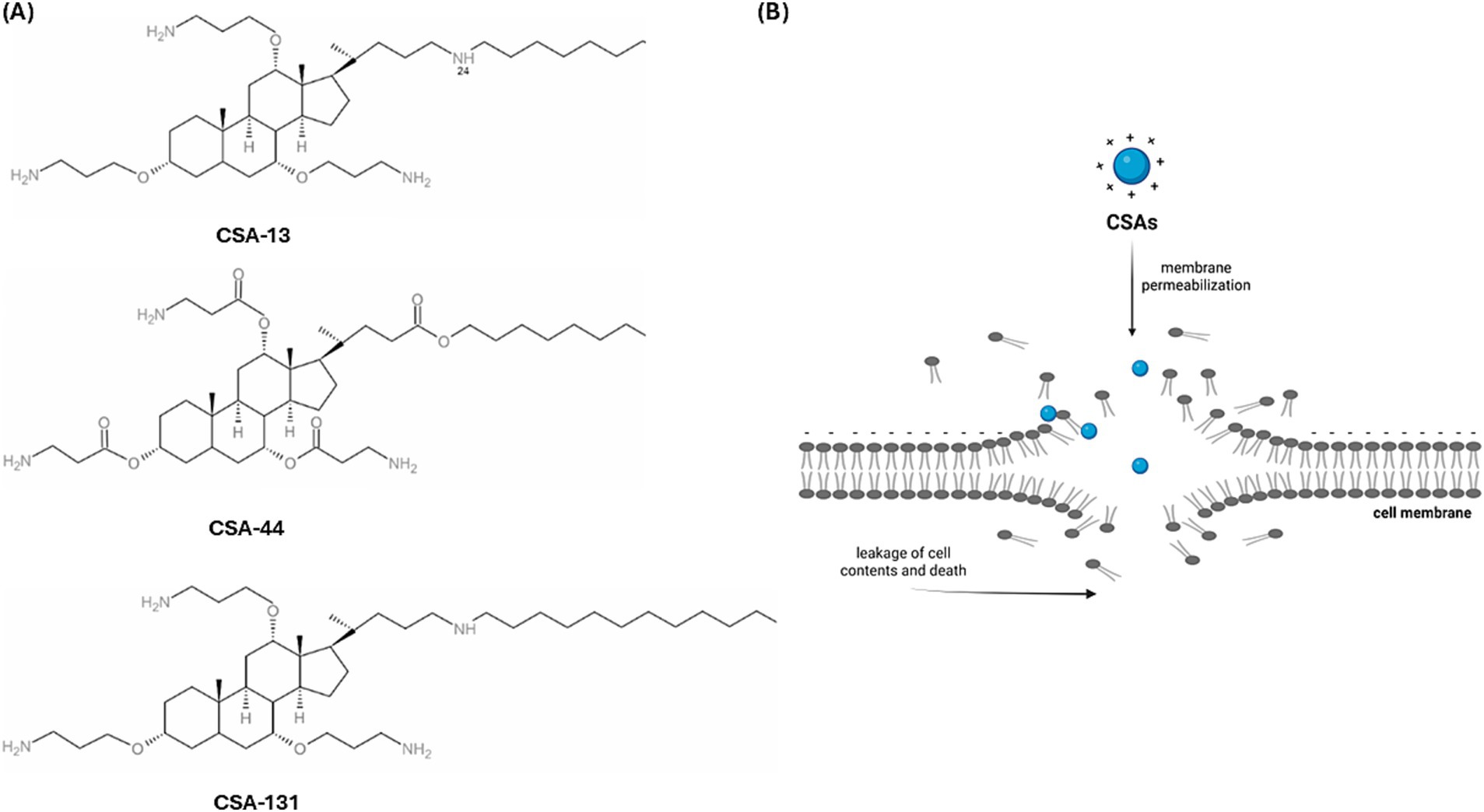 An interesting direction of research is the combination of ceragenins with conventional antibiotics in order to reduce the therapeutic dose. Recently, the activity of CSA-44 and CSA-131 against blood clinical isolates of G (−) bacteria in combination with classical antibiotics was reported (Yilmaz et al., 2023). This study highlights that CSA-44 and CSA-131, alone or in combination with meropenem or ceftazidime + avibactam, should be considered when developing new alternative treatments for infections caused by antibiotic-resistant bacterial strains. Another study confirmed the effectiveness of the combination of CSA-13 with colistin, tobramycin and ciprofloxacin (Bozkurt-Guzel et al., 2014).