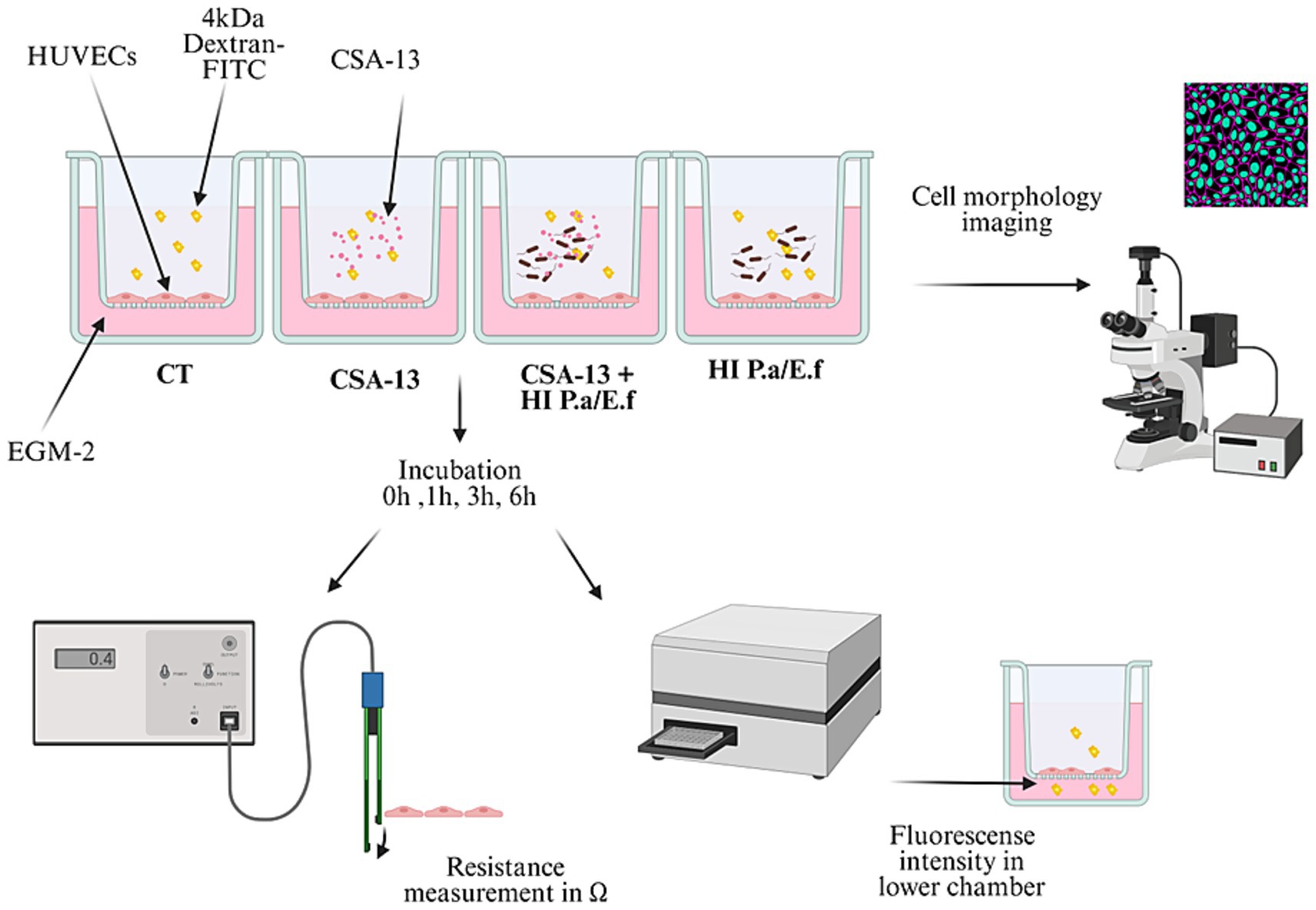 Figure 3. Schematic representation of experimental setting to conduct the permeability/integrity assays using HUVECs monolayers upon addition of ceragenins or their combination with heat-inactivated bacteria [Biorender.io software].