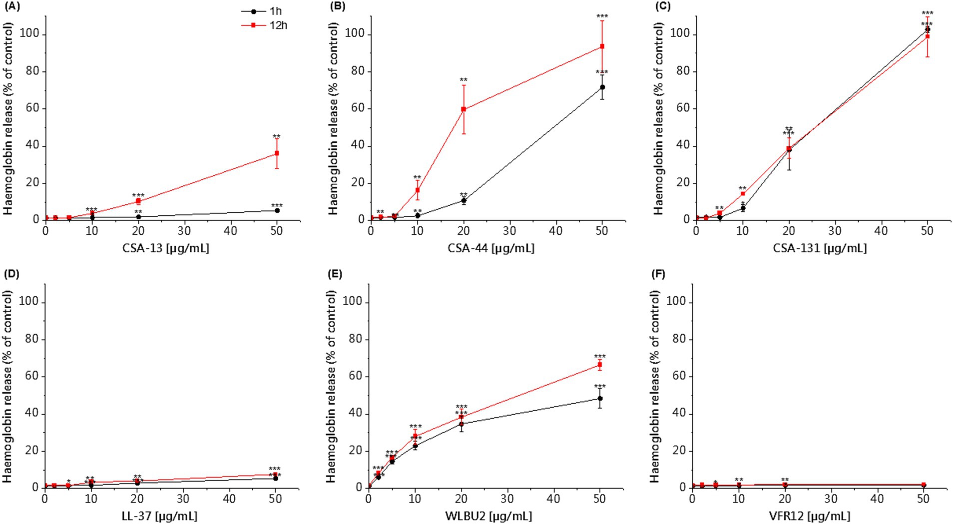 Figure 4. Hemoglobin release from human RBCs after 1 and 12 h of incubation in the presence of CSA-13 (A), CSA-44 (B), and CSA-131 (C), LL-37 (D), WLBU2 (E), VFR12 (F), in the range of 0–50 μg/mL. The results show: mean ± SD, n = 3 (biological replicates); * indicates statistical significance compared to the untreated sample, p ≤ 0.05, ** < 0.02 and *** < 0.001.